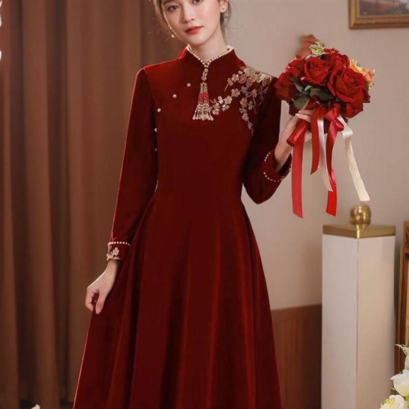 速发新中式旗袍长袖敬酒服新娘订婚结婚出阁礼服酒红色回门连衣裙