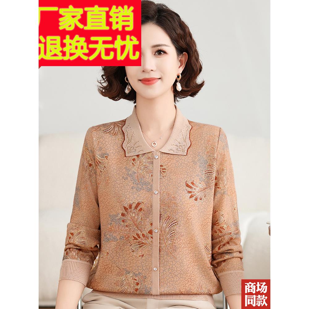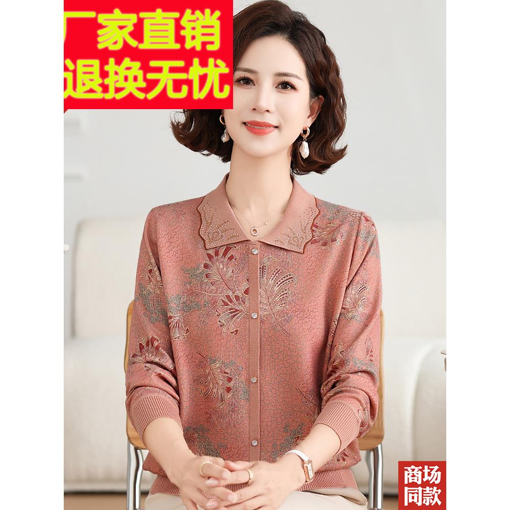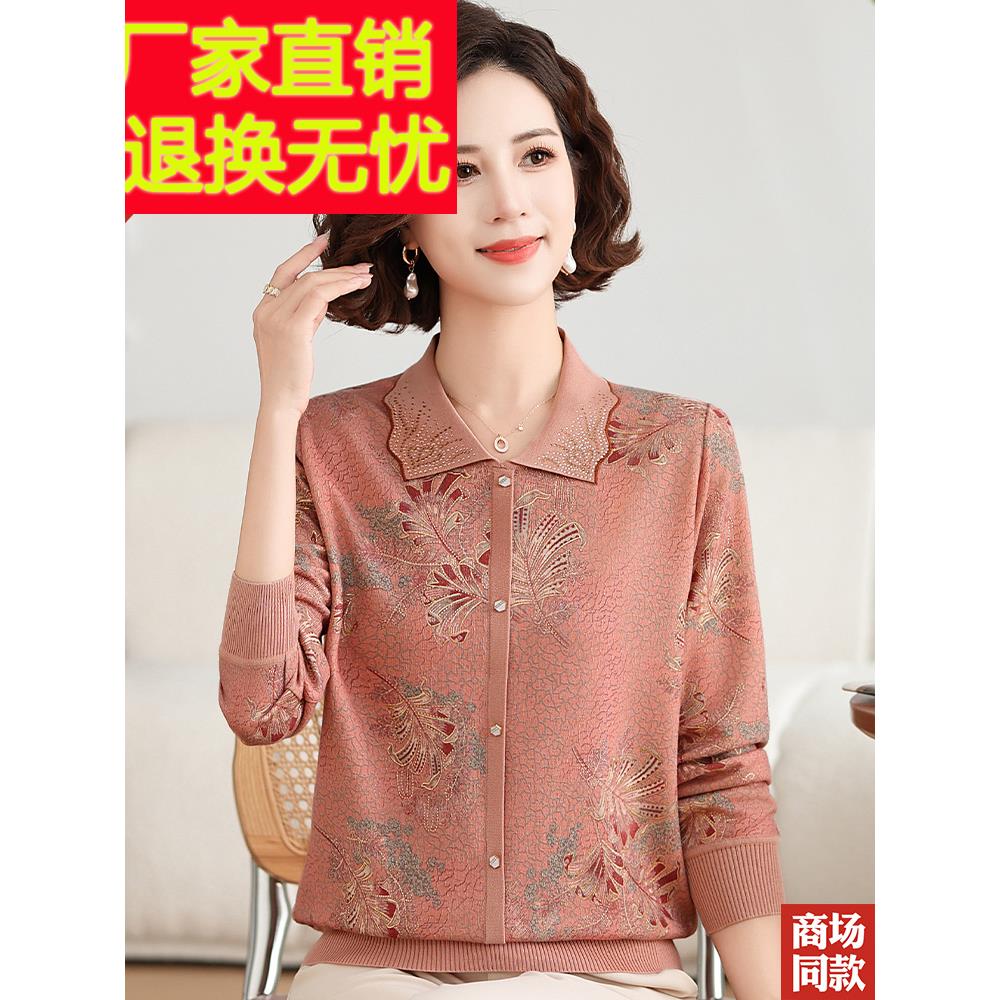 中老年妈妈时尚秋装翻领T恤长袖宽松气质女装针织羊毛衫打底上衣