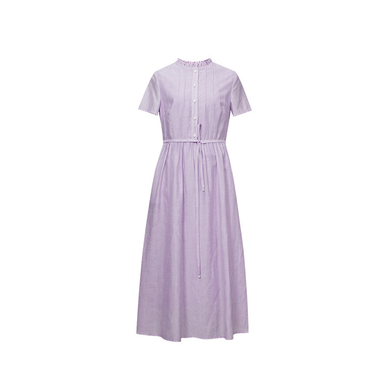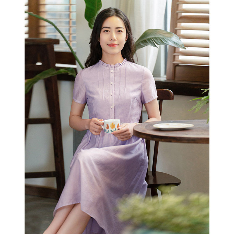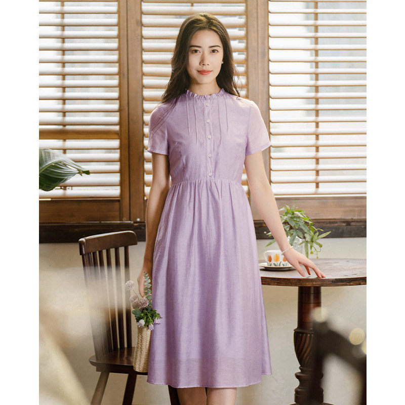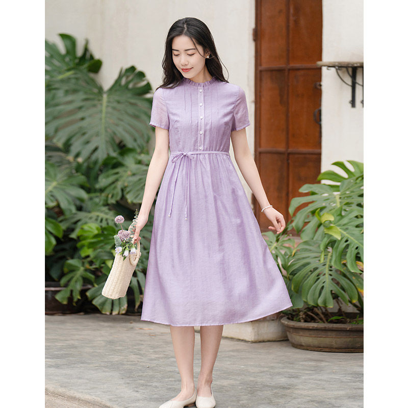 纻衣荷叶领紫色短袖连衣裙女2025夏装新款温婉文艺通勤时尚中长裙