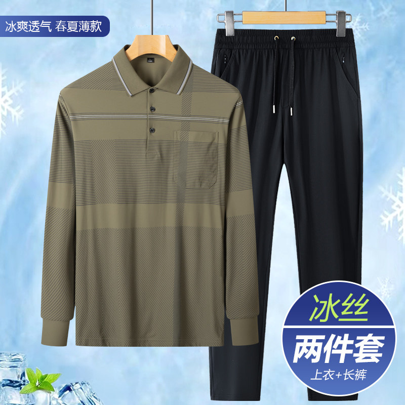 薄款爸爸冰丝套装春夏季中老年休闲长袖T恤男运动长裤两件套口袋