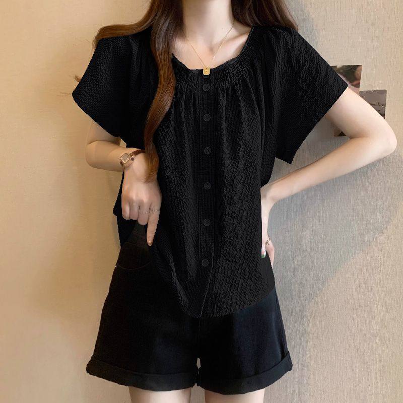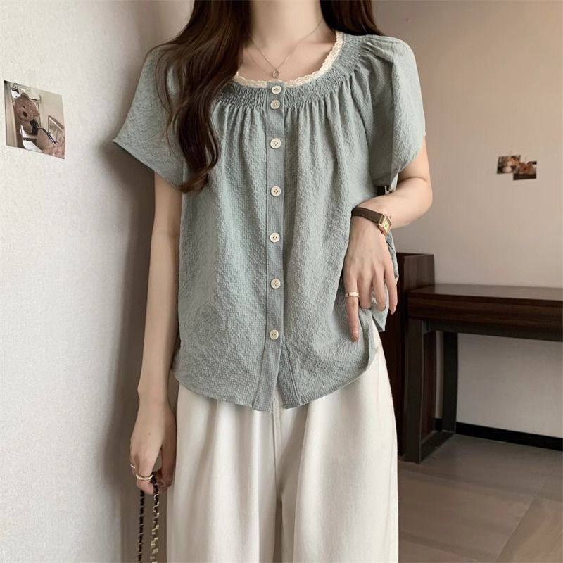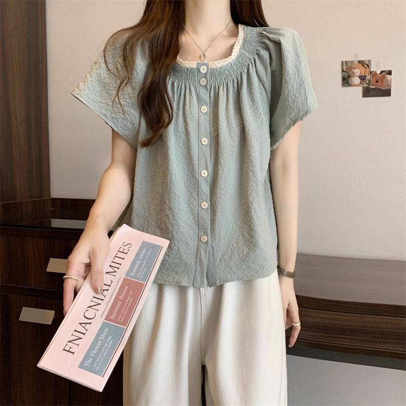 大码法式方领短袖衬衫女夏季胖mm宽松遮肚子显瘦甜美减龄雪纺上衣