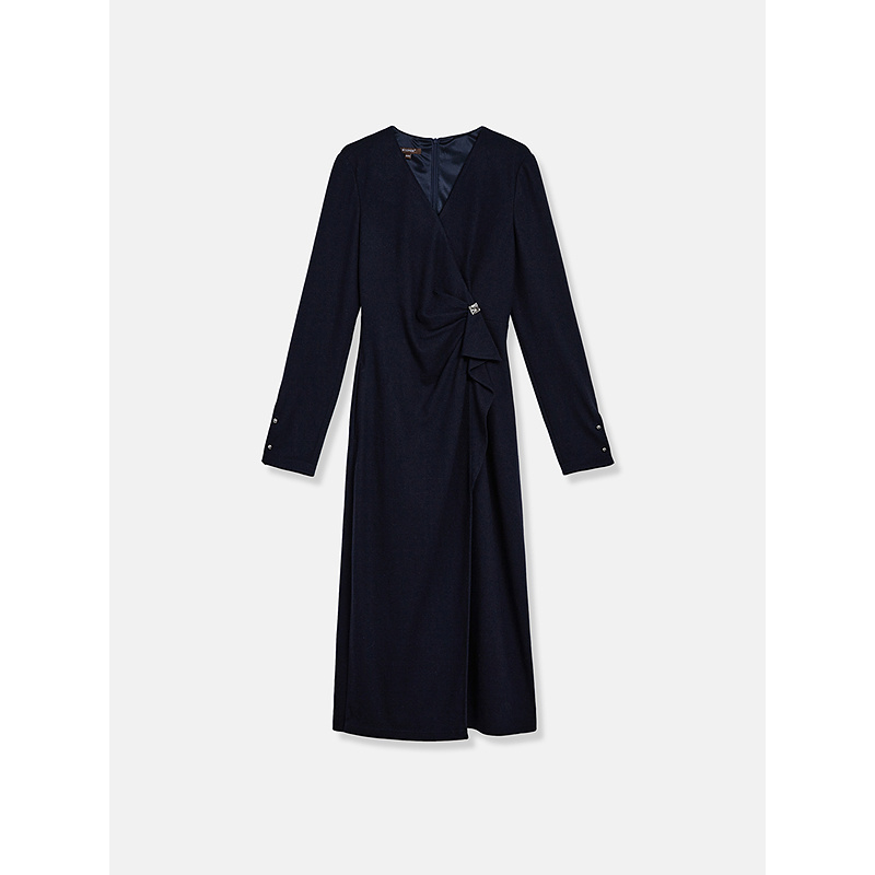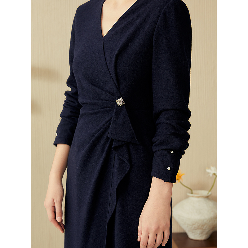 YINER音儿专选2025春季新款法式V领优雅羊毛收腰气质连衣裙