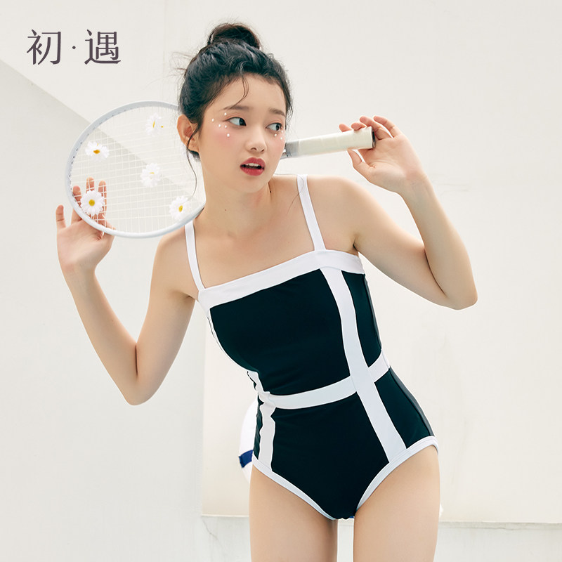初遇新款少女泳衣女孩儿童学生甜美显瘦度假海边黑白拼色连体泳装