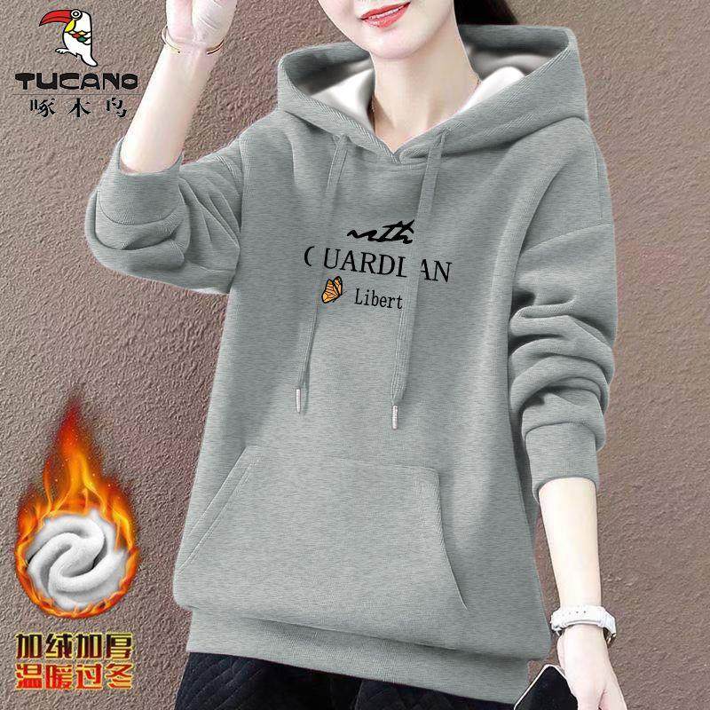 啄木鸟加绒加厚保暖连帽卫衣女2024新款秋冬宽松休闲长袖印花上衣
