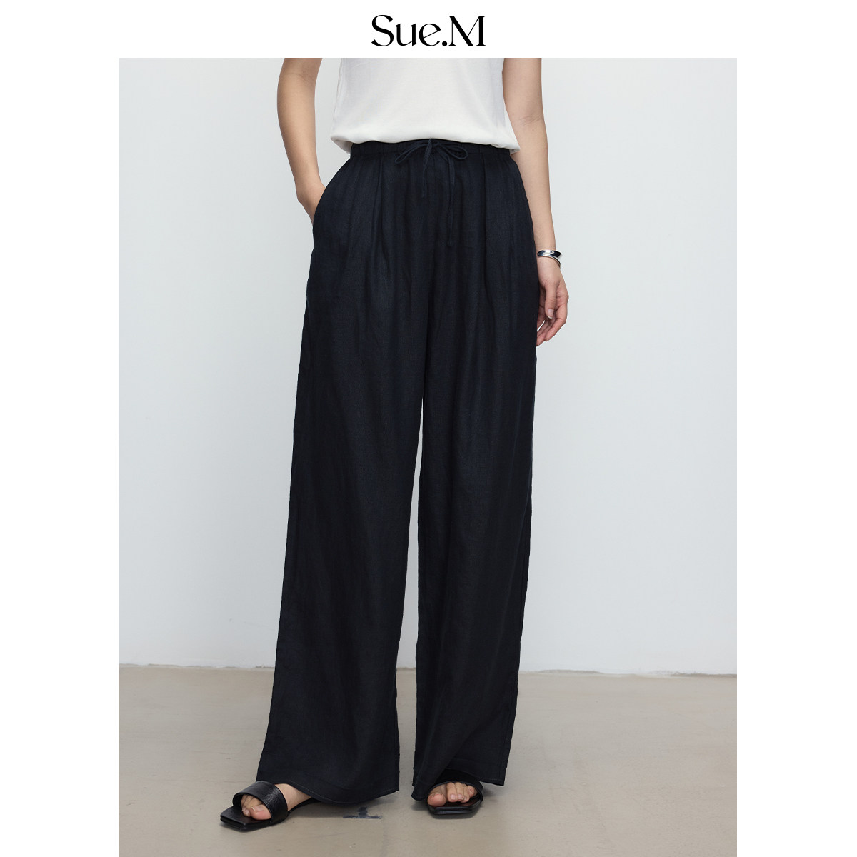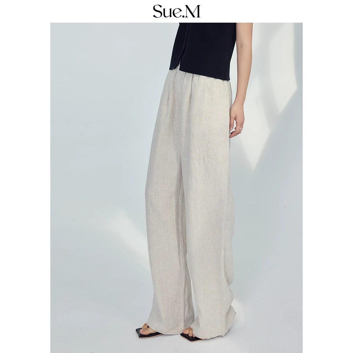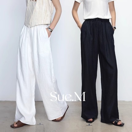 Sue.M 100%进口亚麻裤子白色老钱风松弛感阔腿裤宽松慵懒风套装女