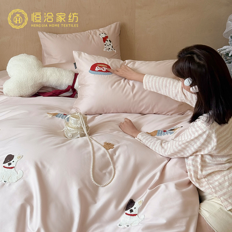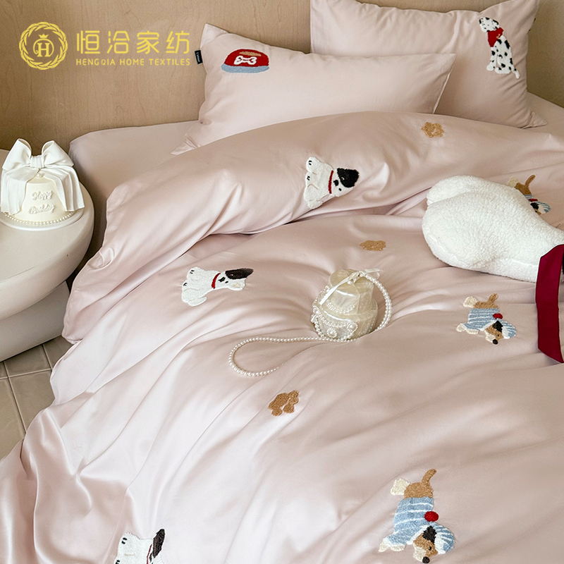 儿童全棉长绒棉纯棉四件套可爱小狗毛巾绣1.2m被套床笠床品粉蓝色