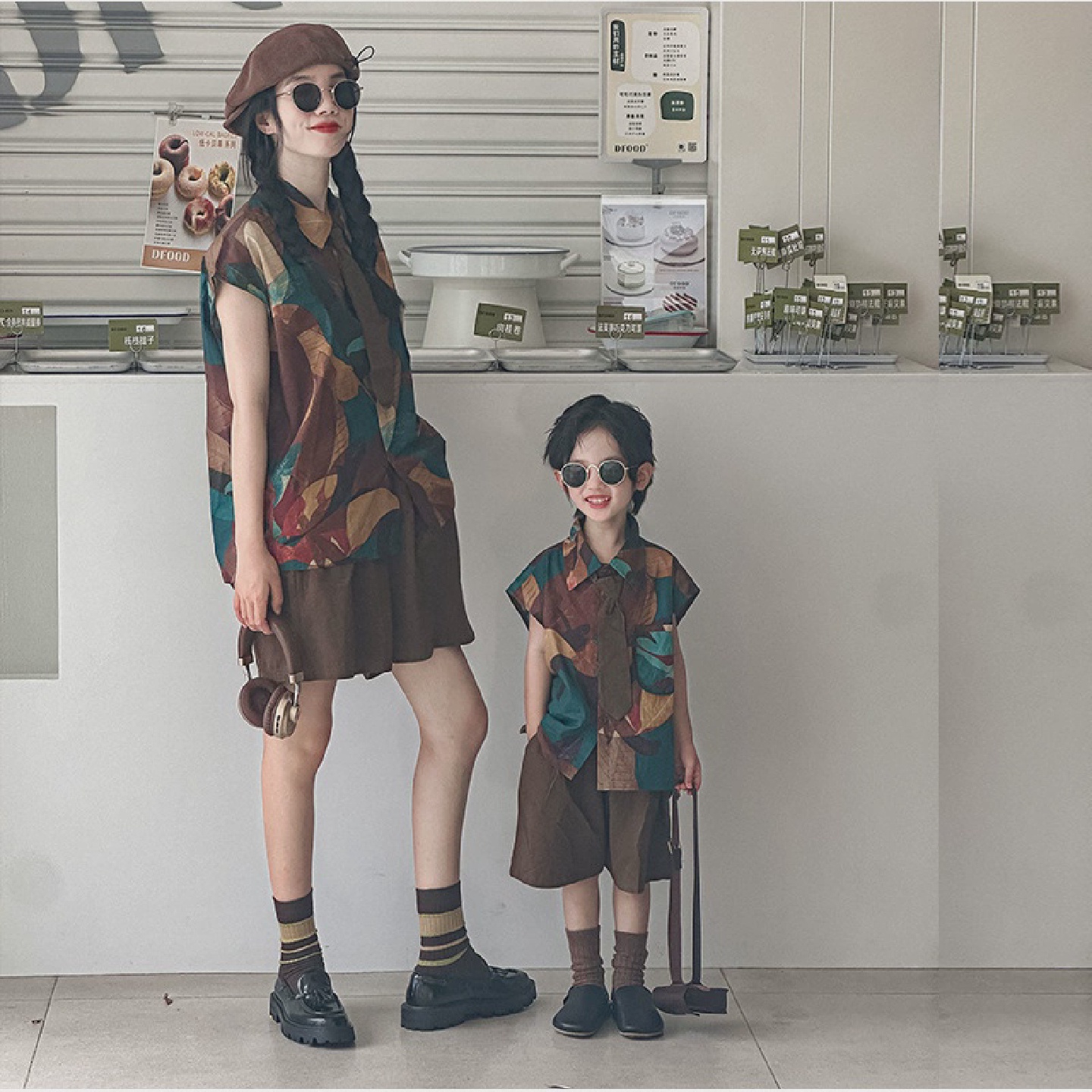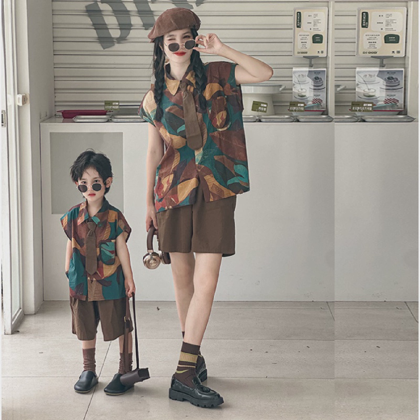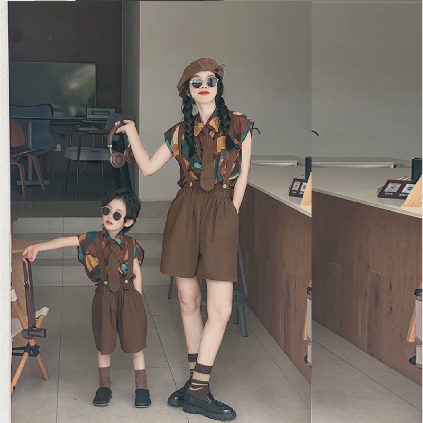 炸街亲子装夏季海边度假风母子装港风碎花衬衫抱婴袋裤套装母女装