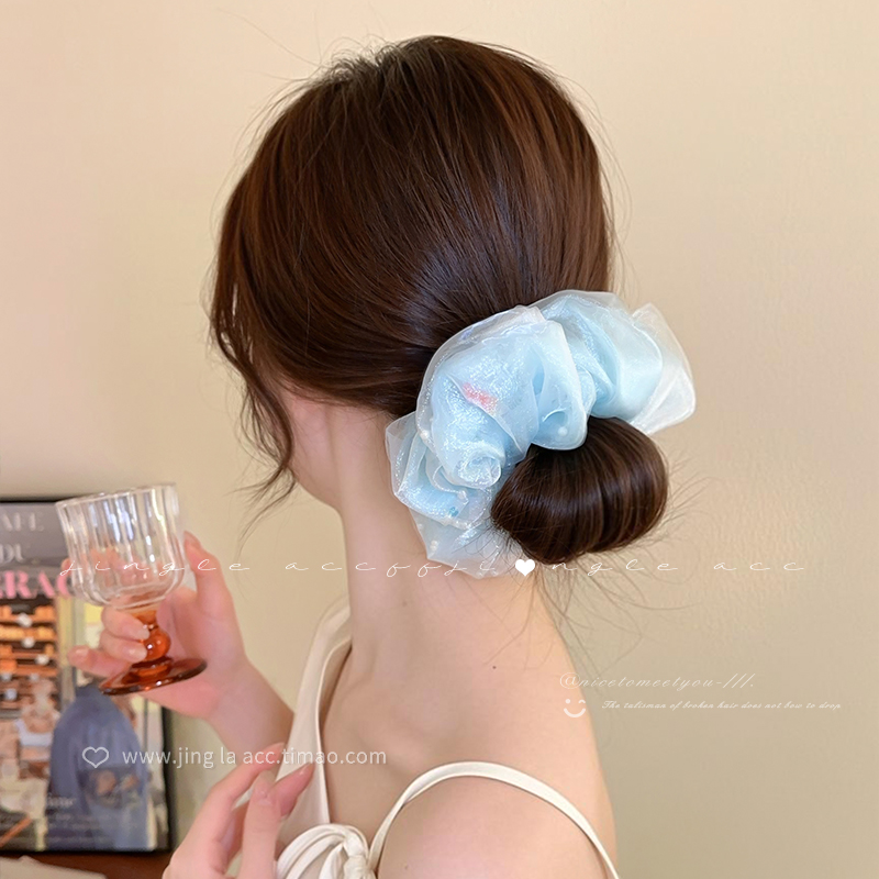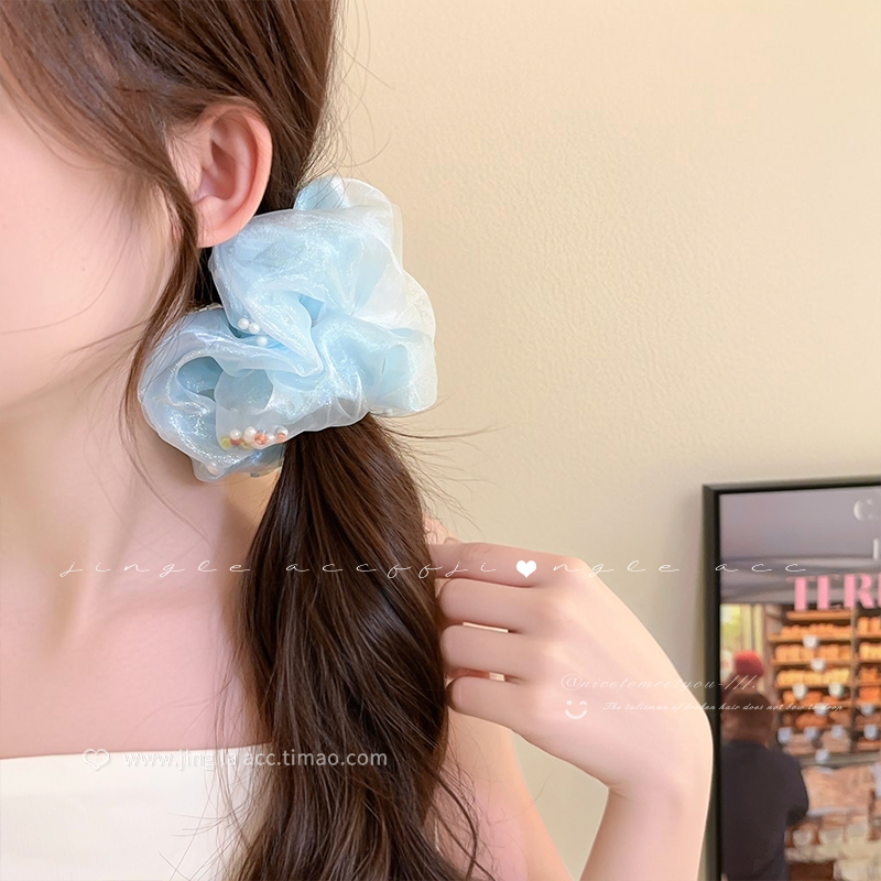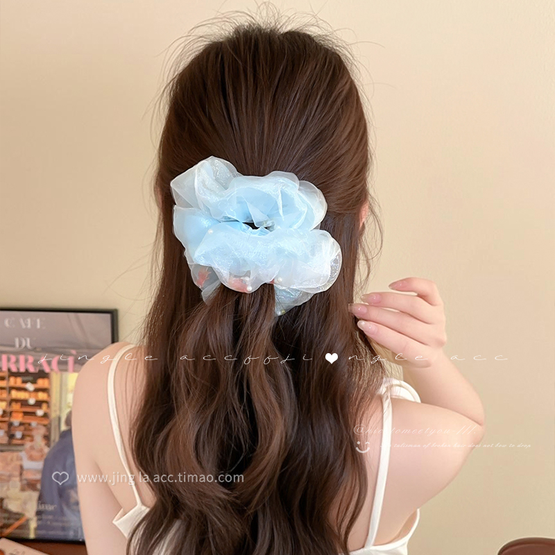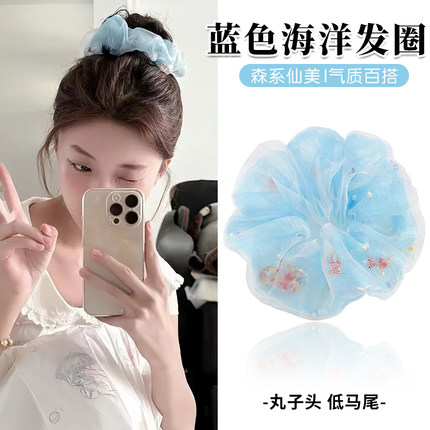 蓝色海洋网纱大肠发圈女高级感2025新款扎丸子头发绳头花头饰发饰