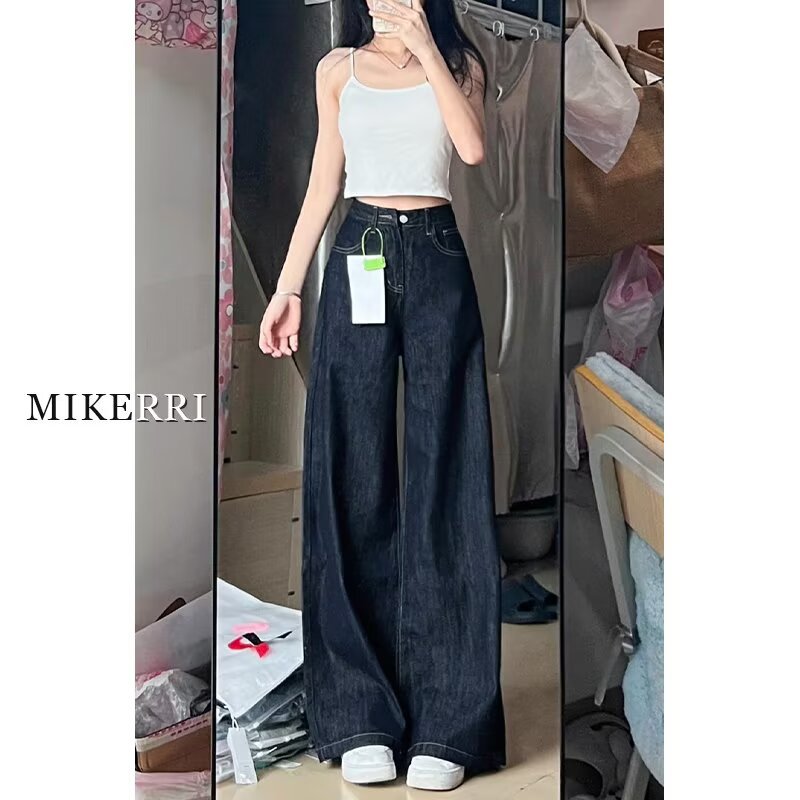 深蓝色A版大阔腿牛仔裤女春季新款高腰宽松遮肉显瘦直筒拖地裤子