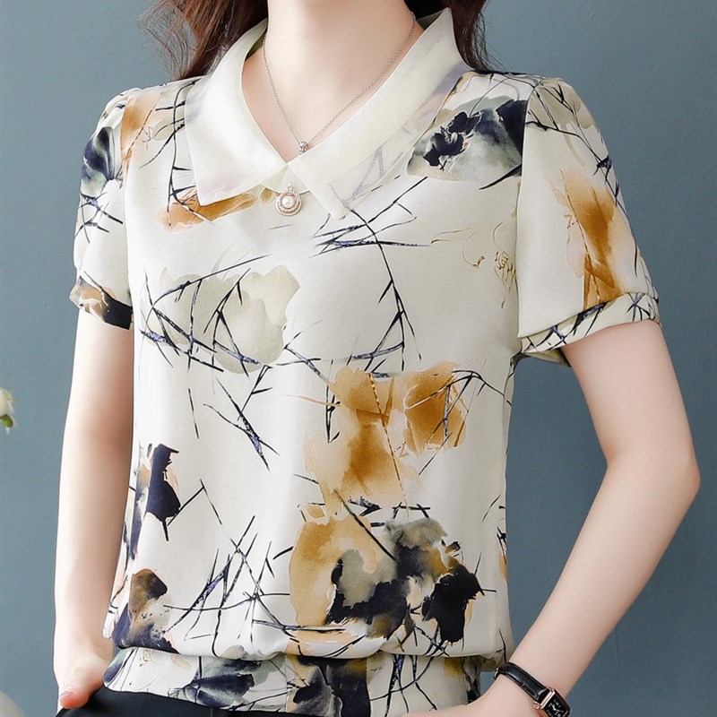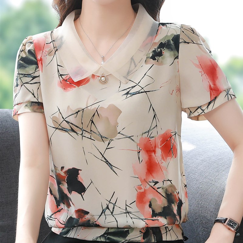碎花雪纺衫女短袖夏季上衣服娃娃领衬衫中年妈妈宽松短款t恤小衫