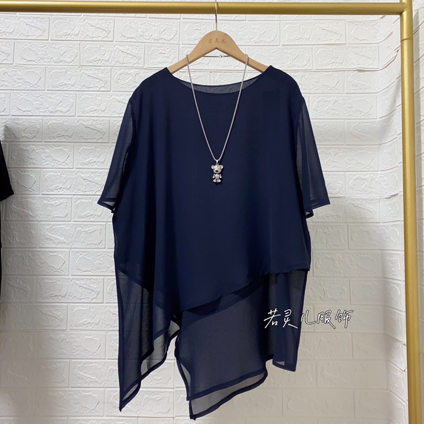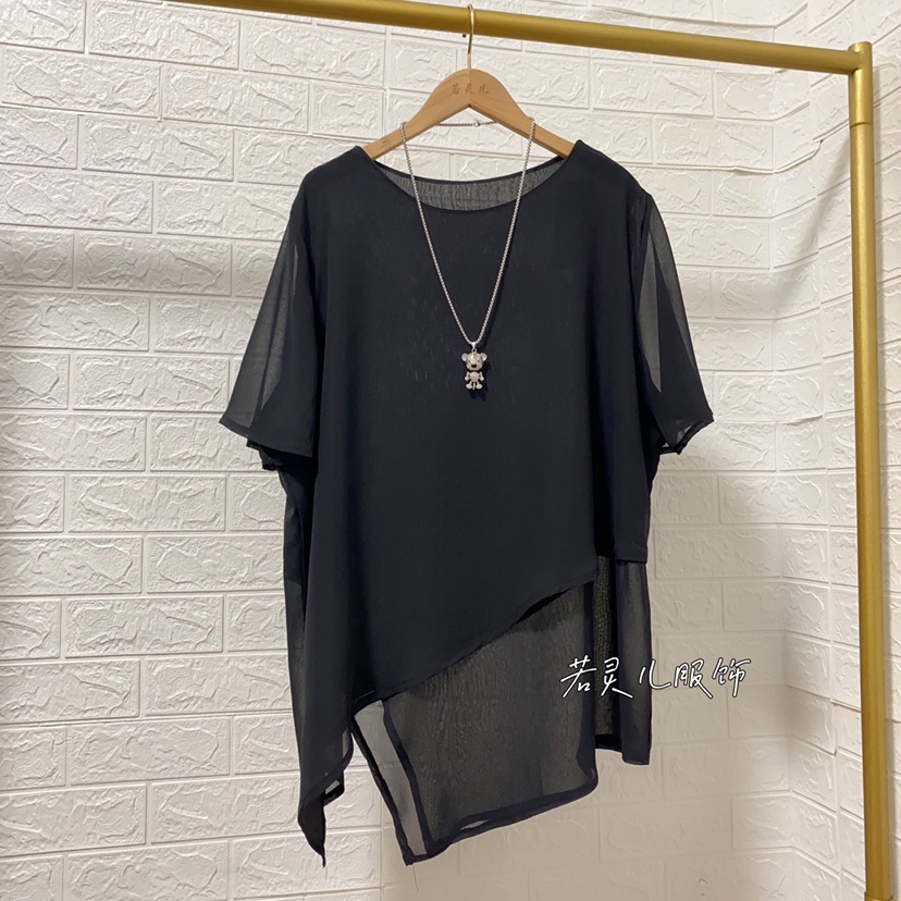 夏季新款不对称下摆短袖雪纺衫宽松休闲遮肚显瘦胖mm大码女装上衣