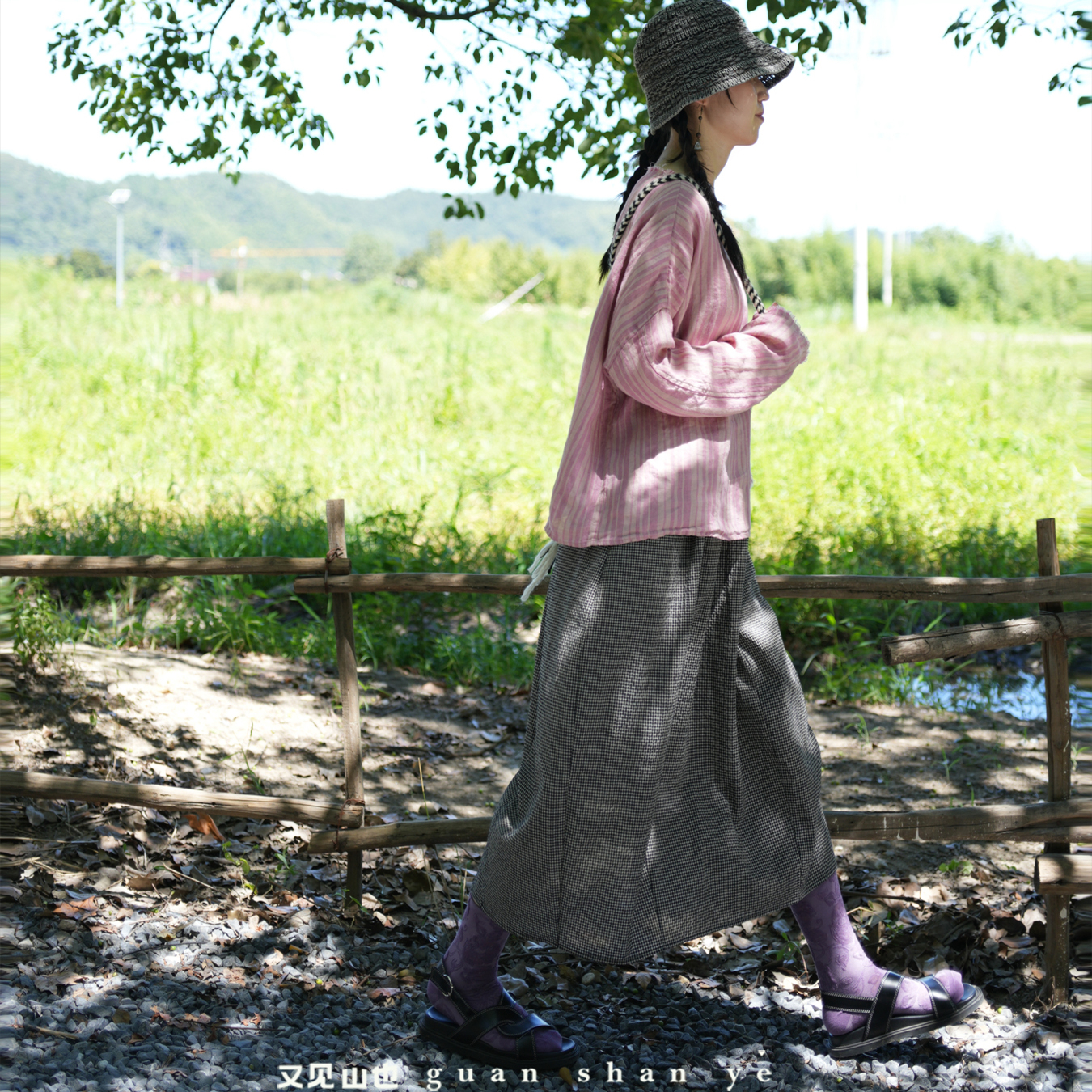 观山也|新款亚麻宽松慵懒套装条纹设计感长袖松弛感格子长裙