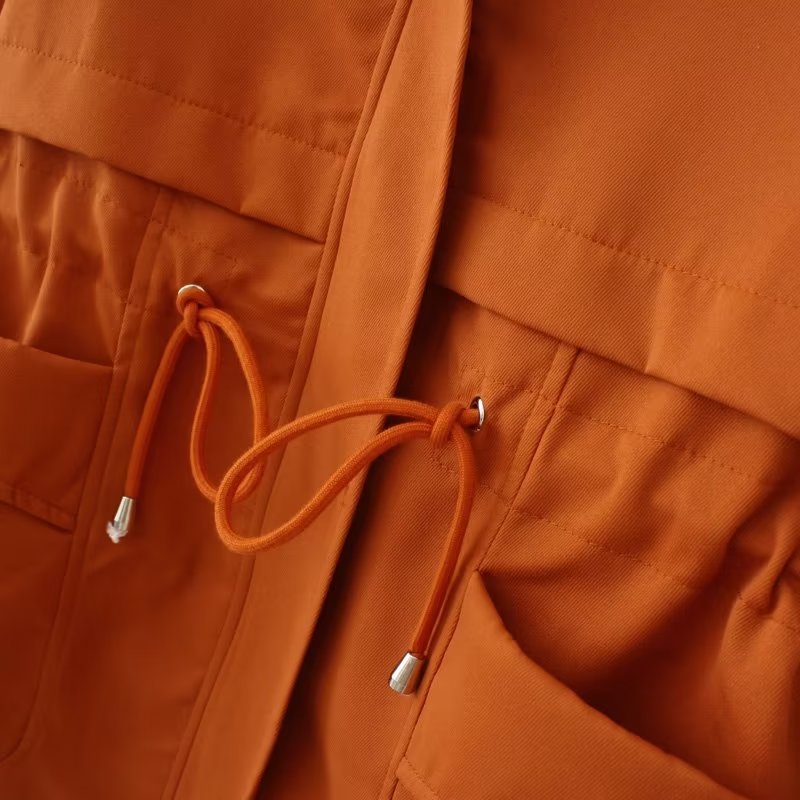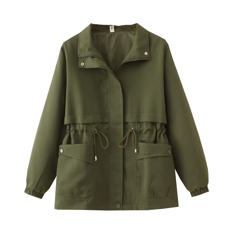 长袖翻领收腰口袋风衣外套