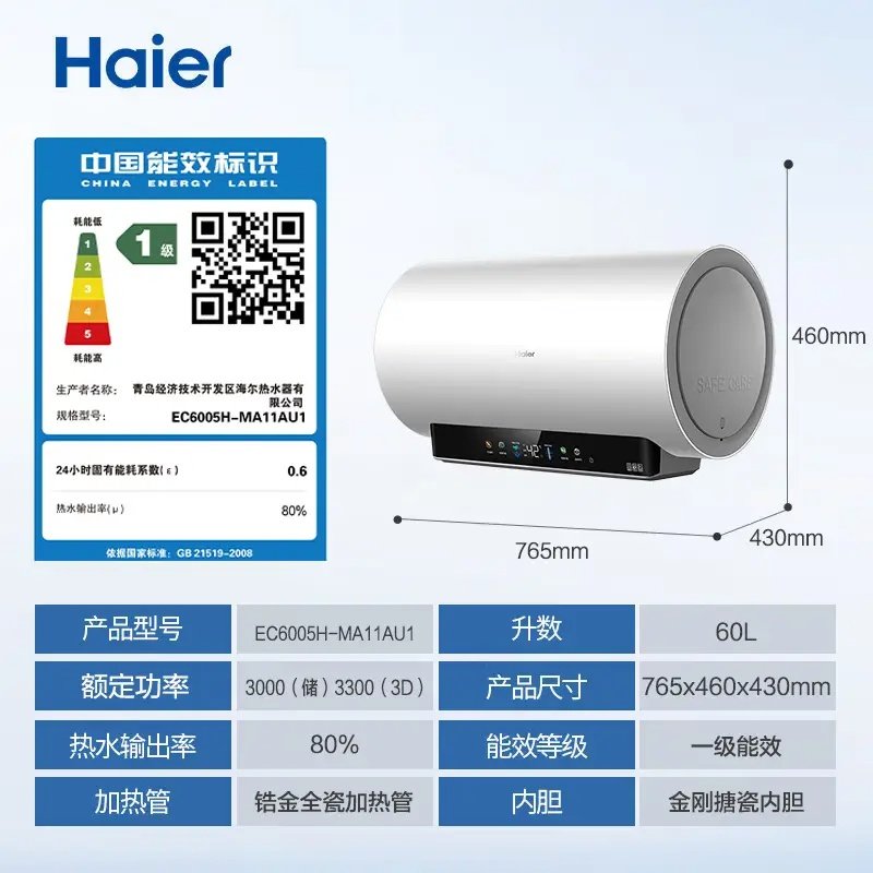 Haier/海尔 EC6005H-MA11AU1 60升电热水器3D速热一级能效免清洗
