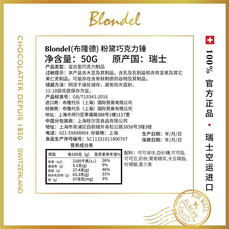 Blondel布隆德 粉黛巧克力锤 瑞士进口纯可可脂高端休闲零食糖果