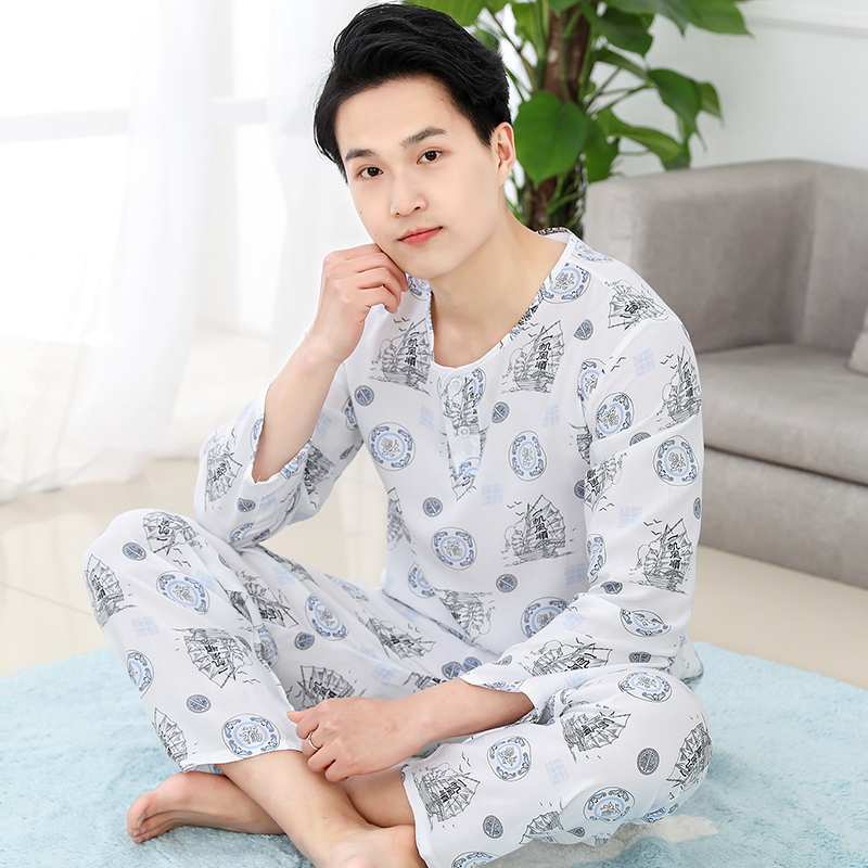 棉绸睡衣男士春夏季长袖超薄款绵绸套装夏季绵绸简约版空调家居服