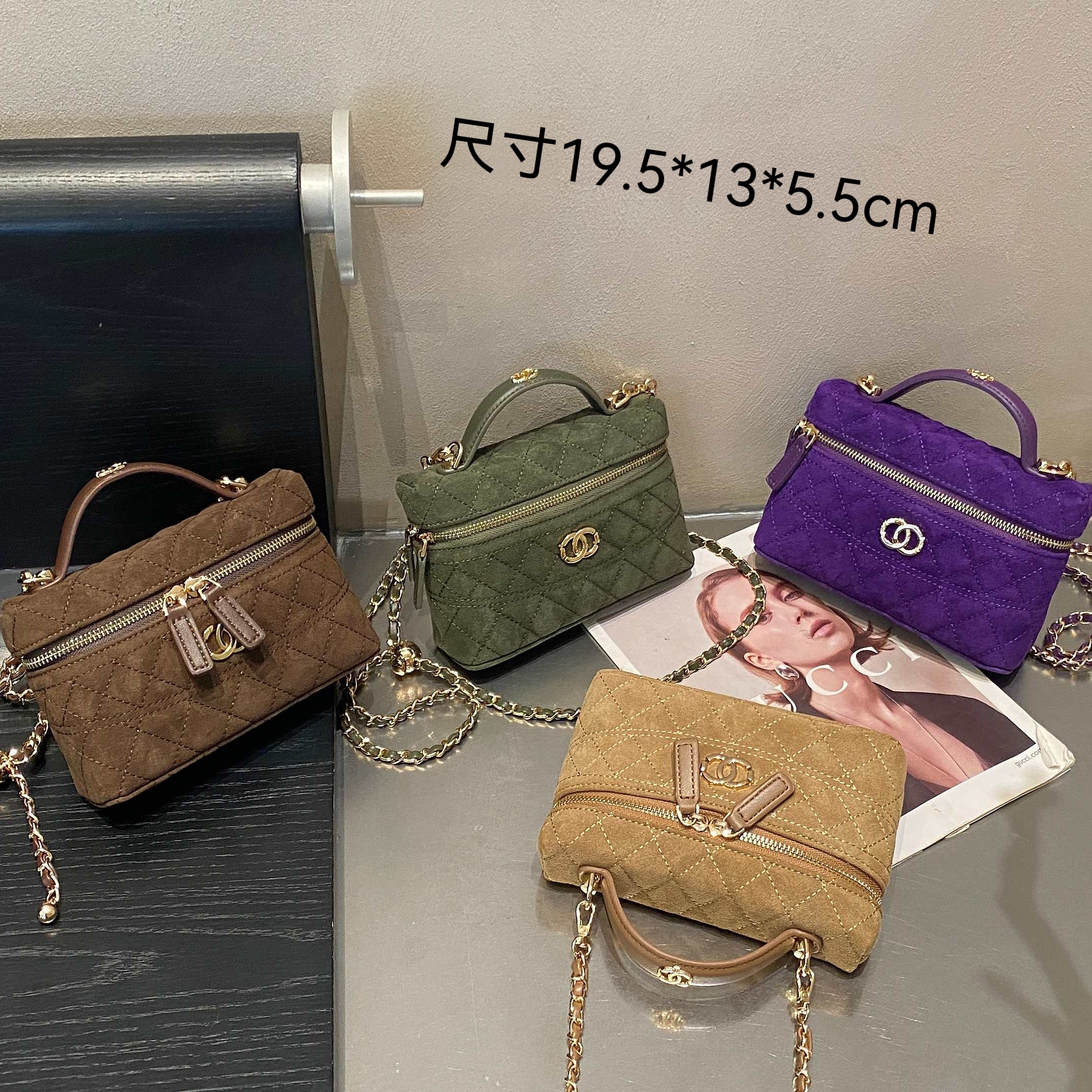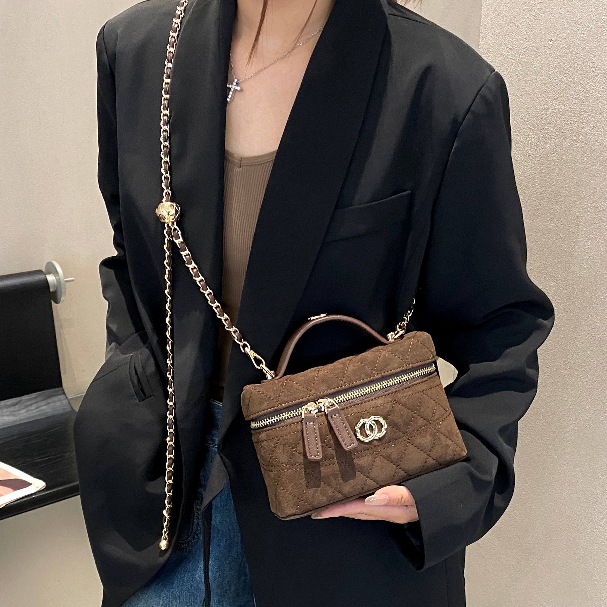 2025新款小香风磨砂皮菱格链条盒子包复古百搭手提单肩斜挎小方包