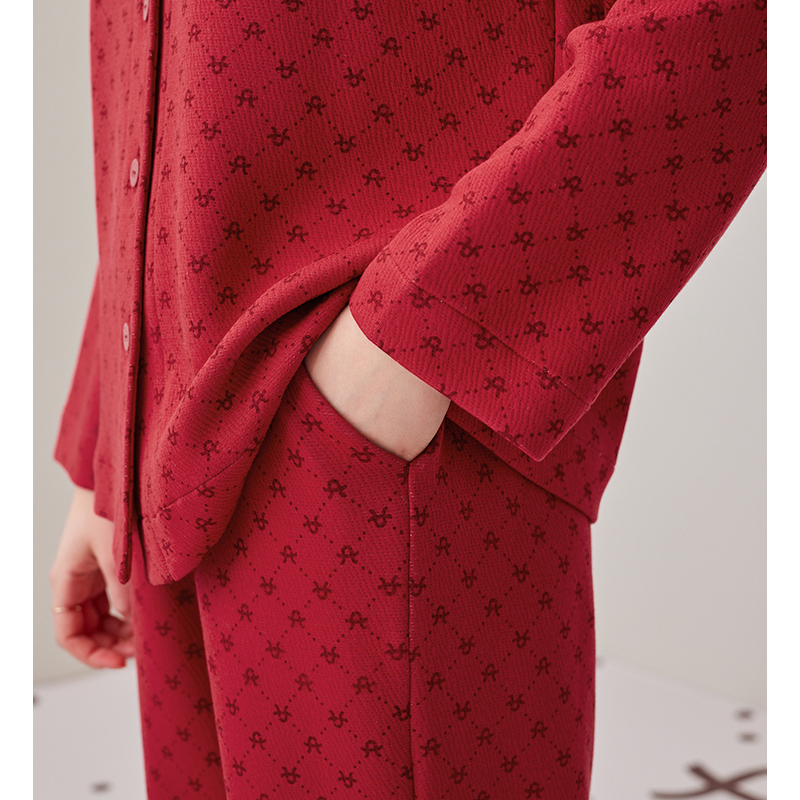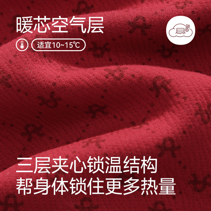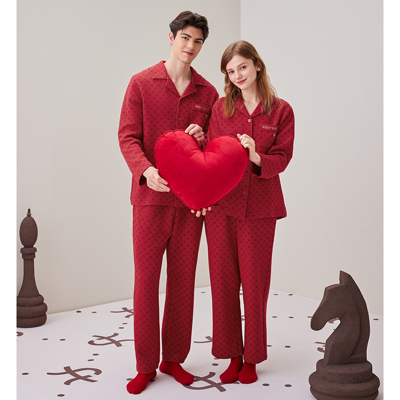 芬腾情侣睡衣纯棉秋冬空气棉夹层长袖女抗菌红色本命年男士家居服