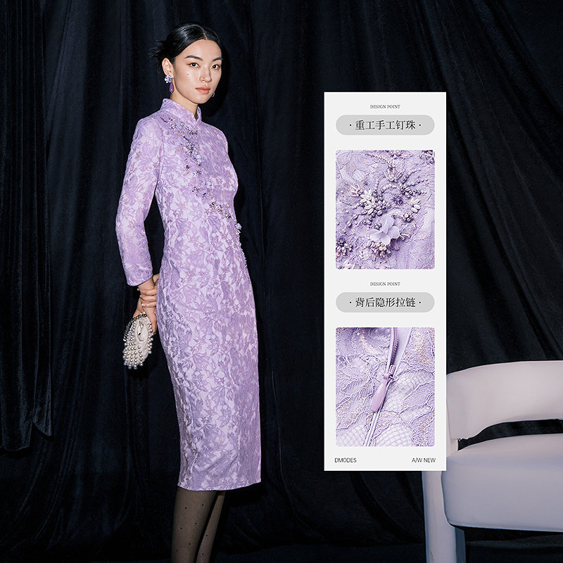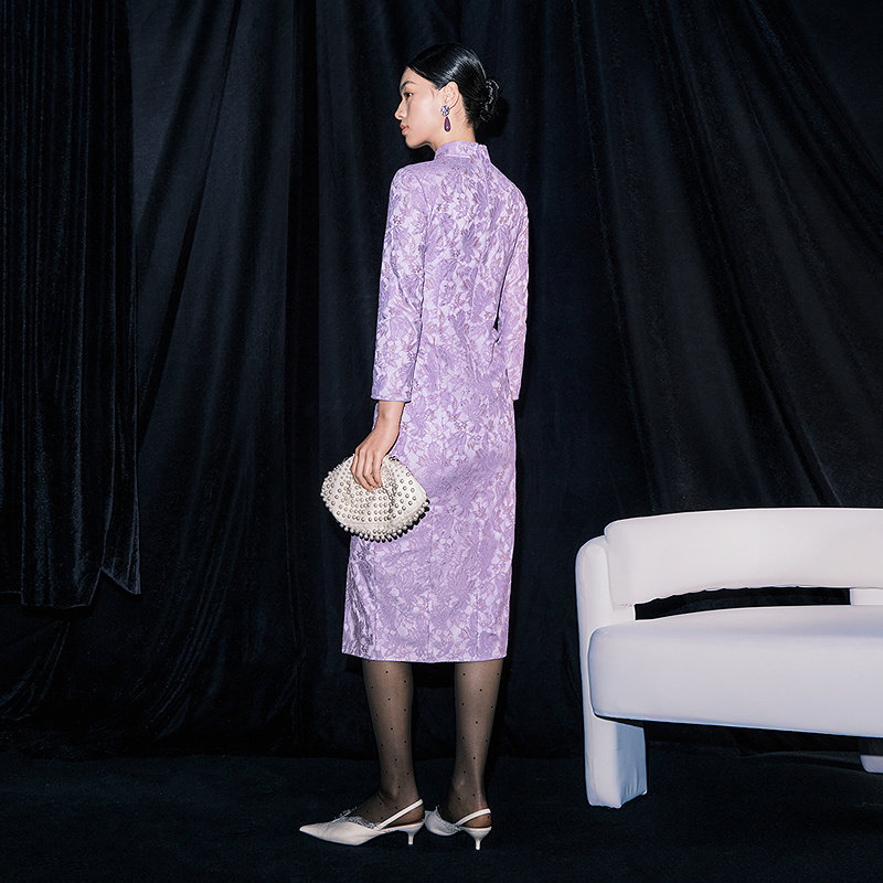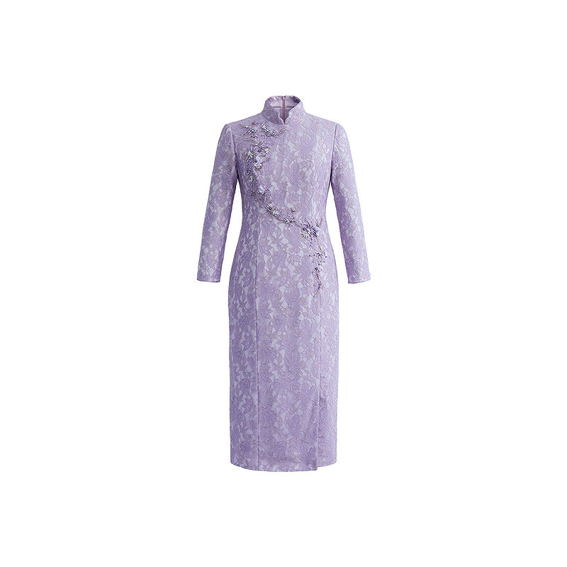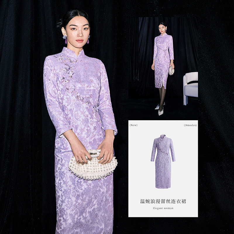 【商场同款】黛玛诗2026春季新款蕾丝连衣裙中式国风旗袍紫色