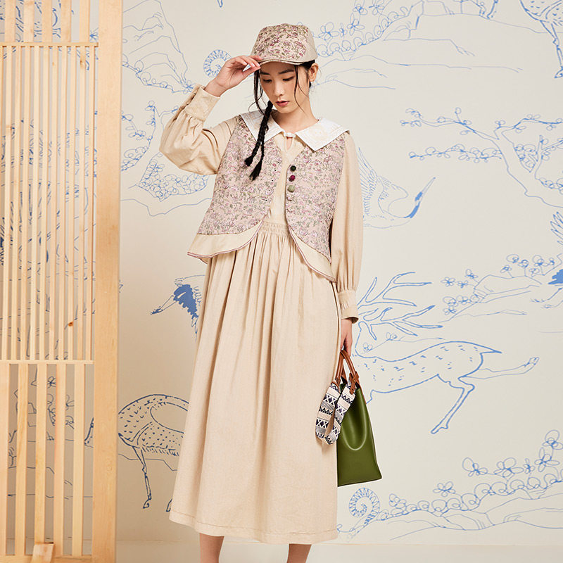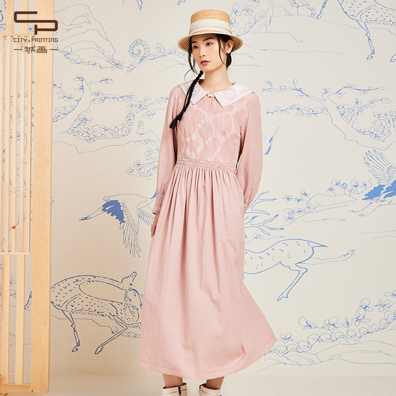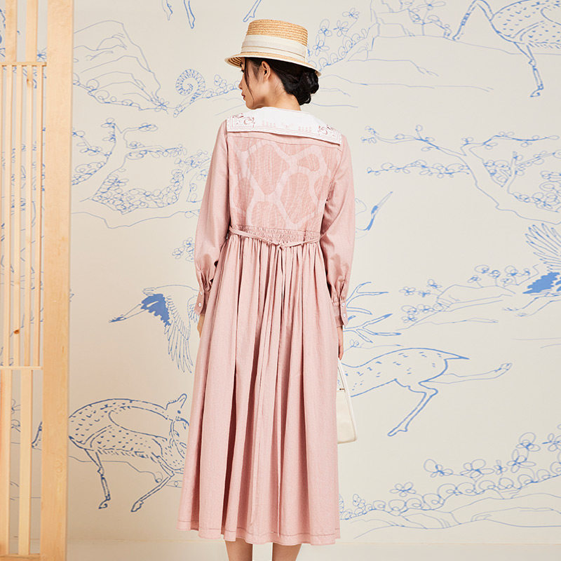 一城画一春季复古文艺范提花连衣裙娃娃领系带收腰长裙粉红/卡其