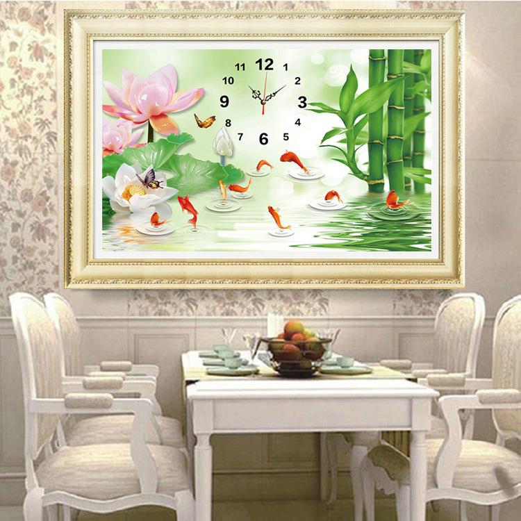 荷花鱼图5d钻石画满钻2024新款钟表点砖贴钻十字绣棉线客厅挂时钟