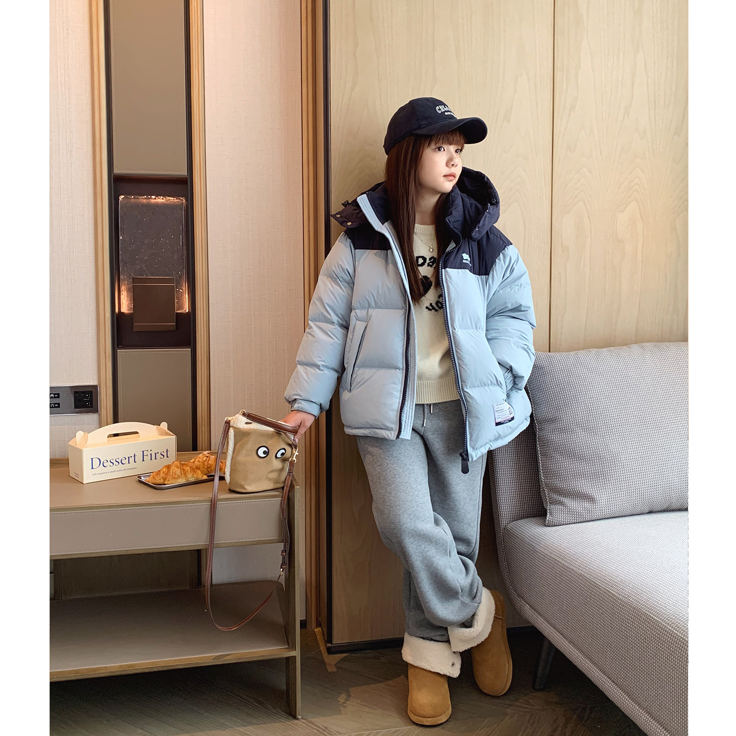 女大童连帽拼色羽绒服2025冬季新款青少年休闲加厚面包服学生外套