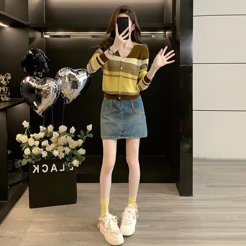 女短裙半身条纹针织秋款开衫爆款套装单排洋气领V2025扣撞色牛仔