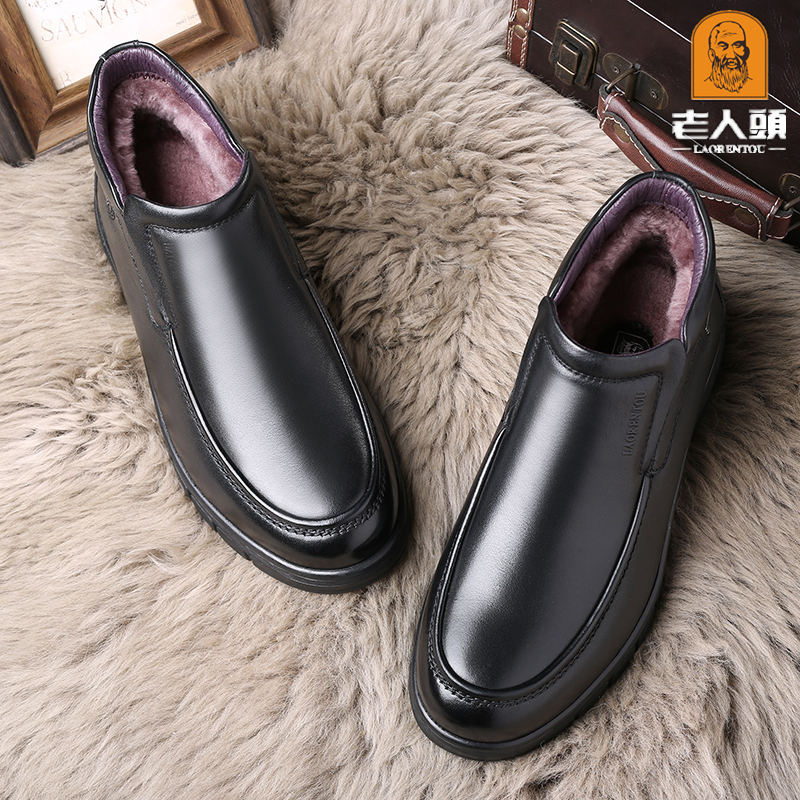 老人头高帮鞋男真皮冬季加绒羊毛保暖商务休闲皮鞋男中年防滑棉鞋