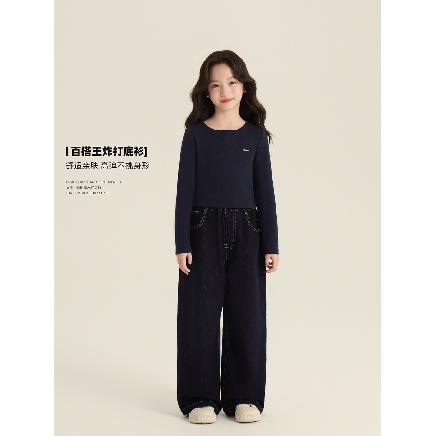 Amybaby女童上衣秋季2025新款简约纯色修身超好看V领长袖T恤