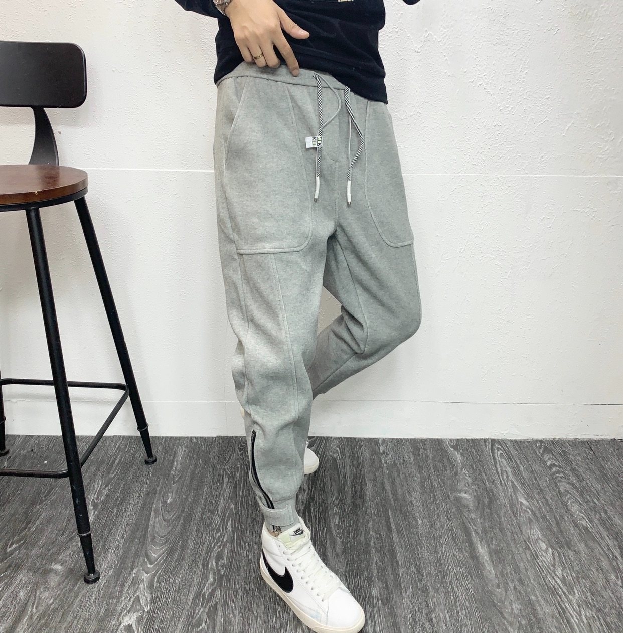 白色运动裤男士休闲裤子宽松拉链束脚修身灰色卫裤男春秋小脚裤潮
