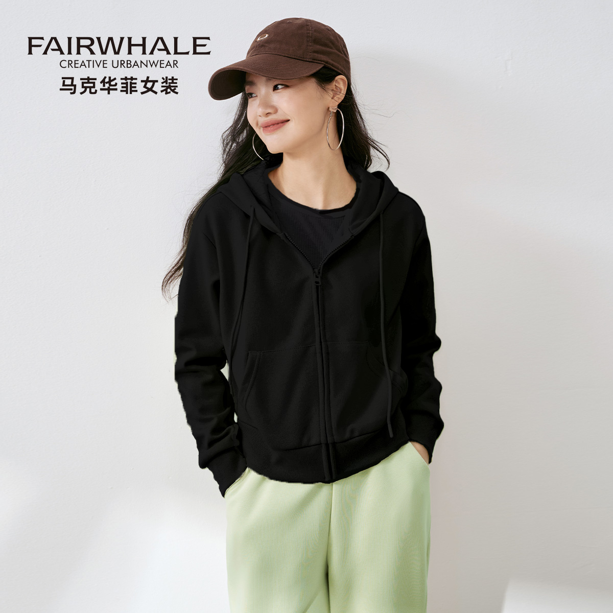 马克华菲宽松休闲短款连帽卫衣女2025新款秋季拉链开衫纯色外套潮