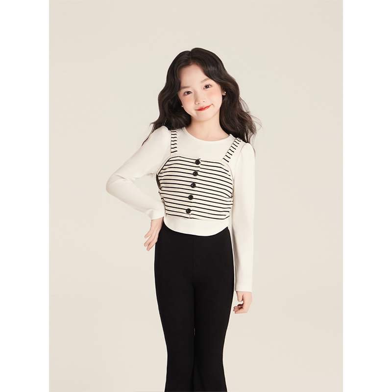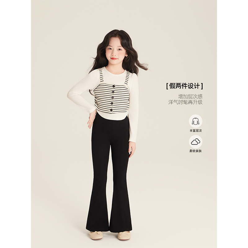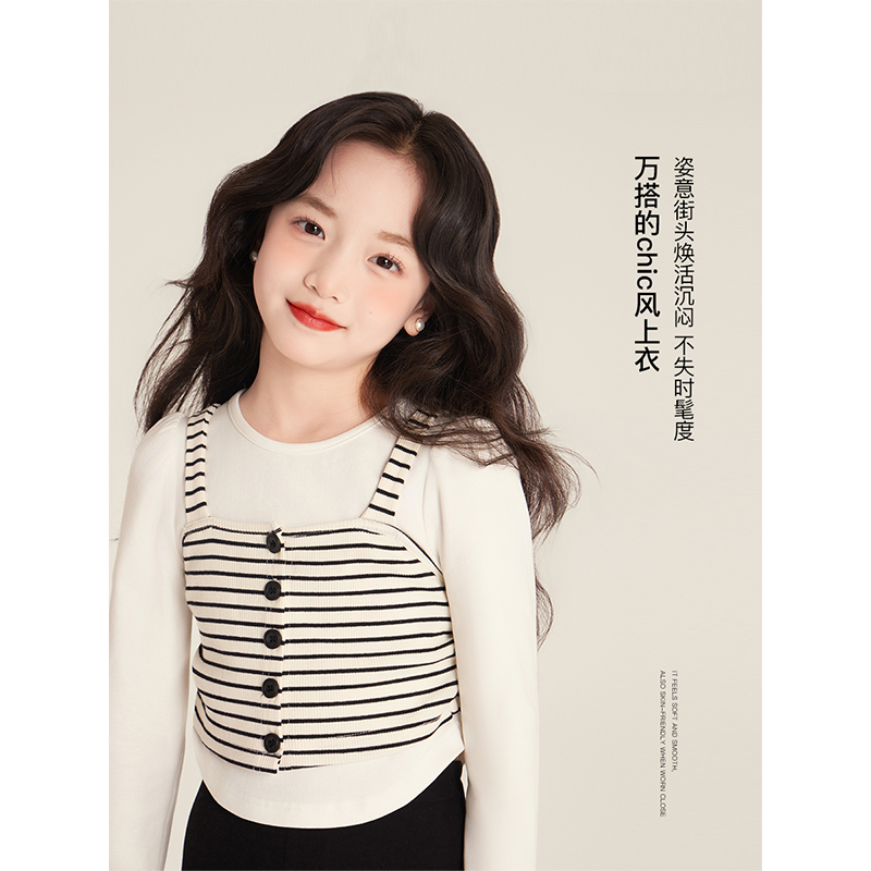 Amybaby女童上衣秋季2025新款设计感褶皱条纹吊带不规则纯色打底