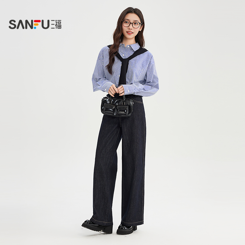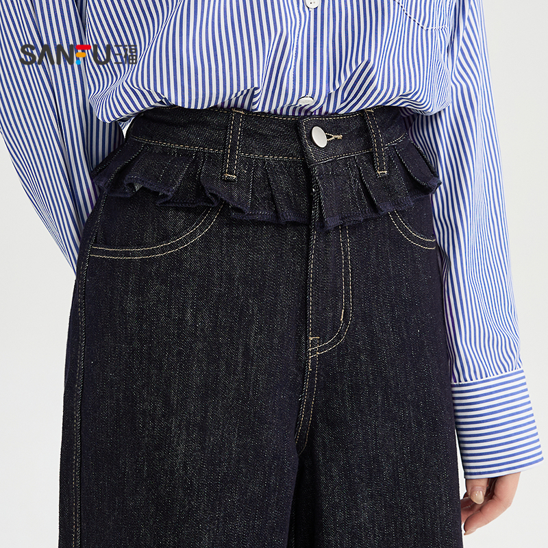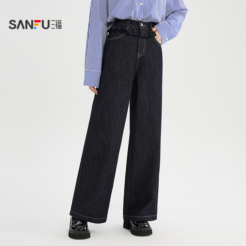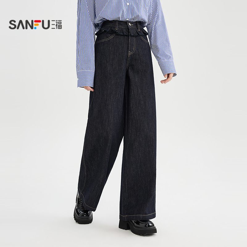 三福牛仔长裤2025秋季时尚荷叶边腰头宽松阔腿裤女装504858