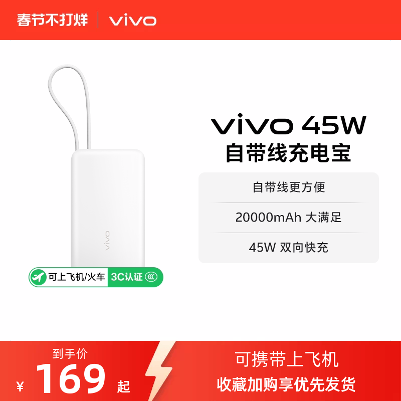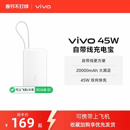 【 3C认证】vivo自带线充电宝20000毫安45w可上飞机大容量快充便携移动电源户外出行