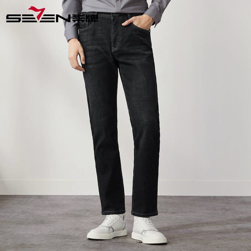 【加绒含绵羊毛】柒牌加厚黑色牛仔裤2025冬季新款男士直筒休闲裤
