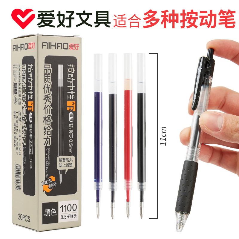 爱好按动笔芯0.5子弹头1100盒装20支装商务办公学生按子中性笔水性笔水芯配套芯替芯替换芯黑色红色蓝色批发