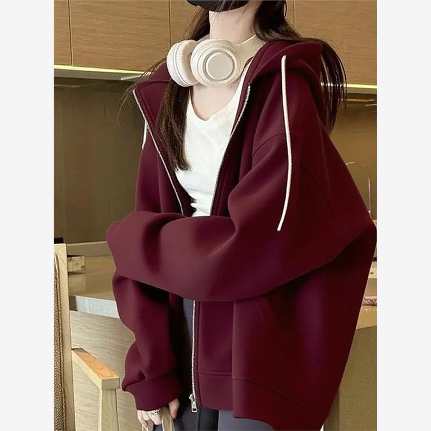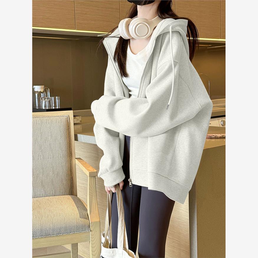 新款连帽开衫灰色卫衣女秋冬中长款宽松情侣外套慵懒风加绒上衣潮