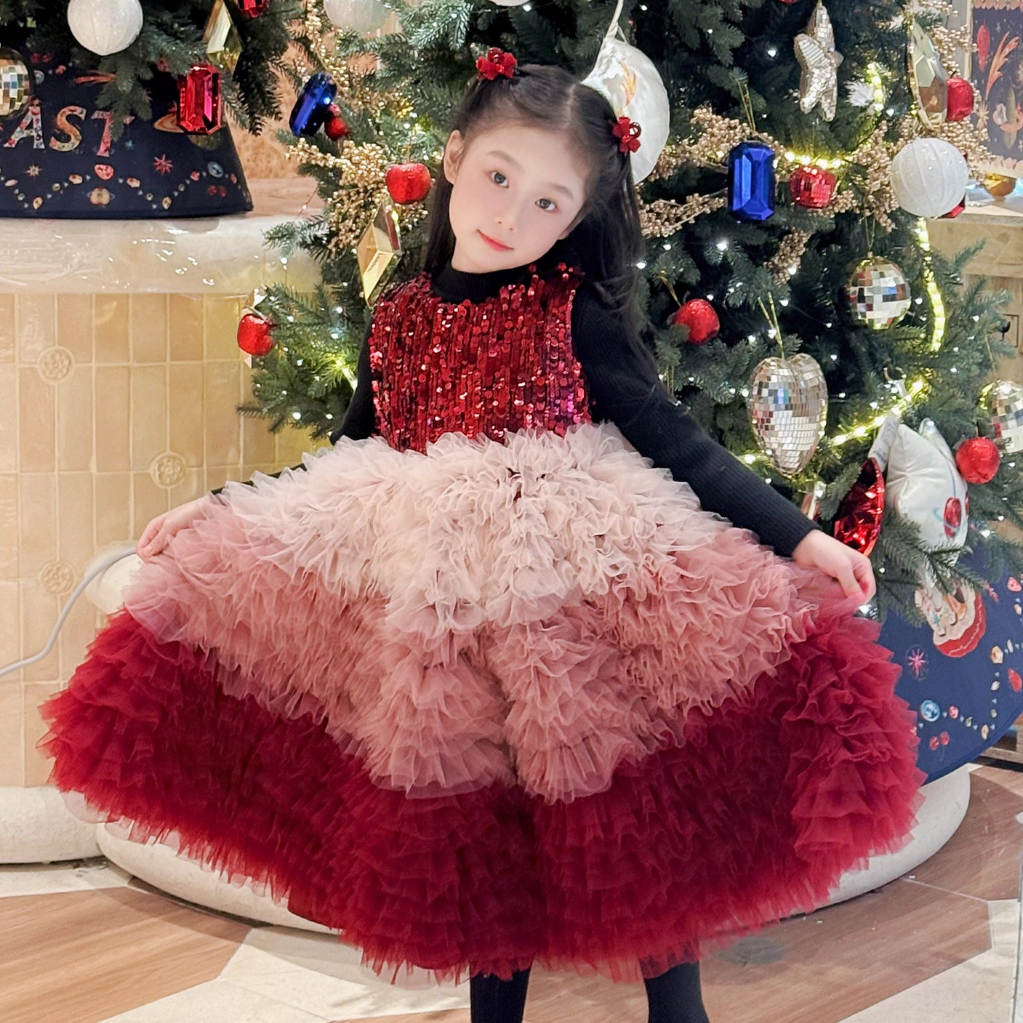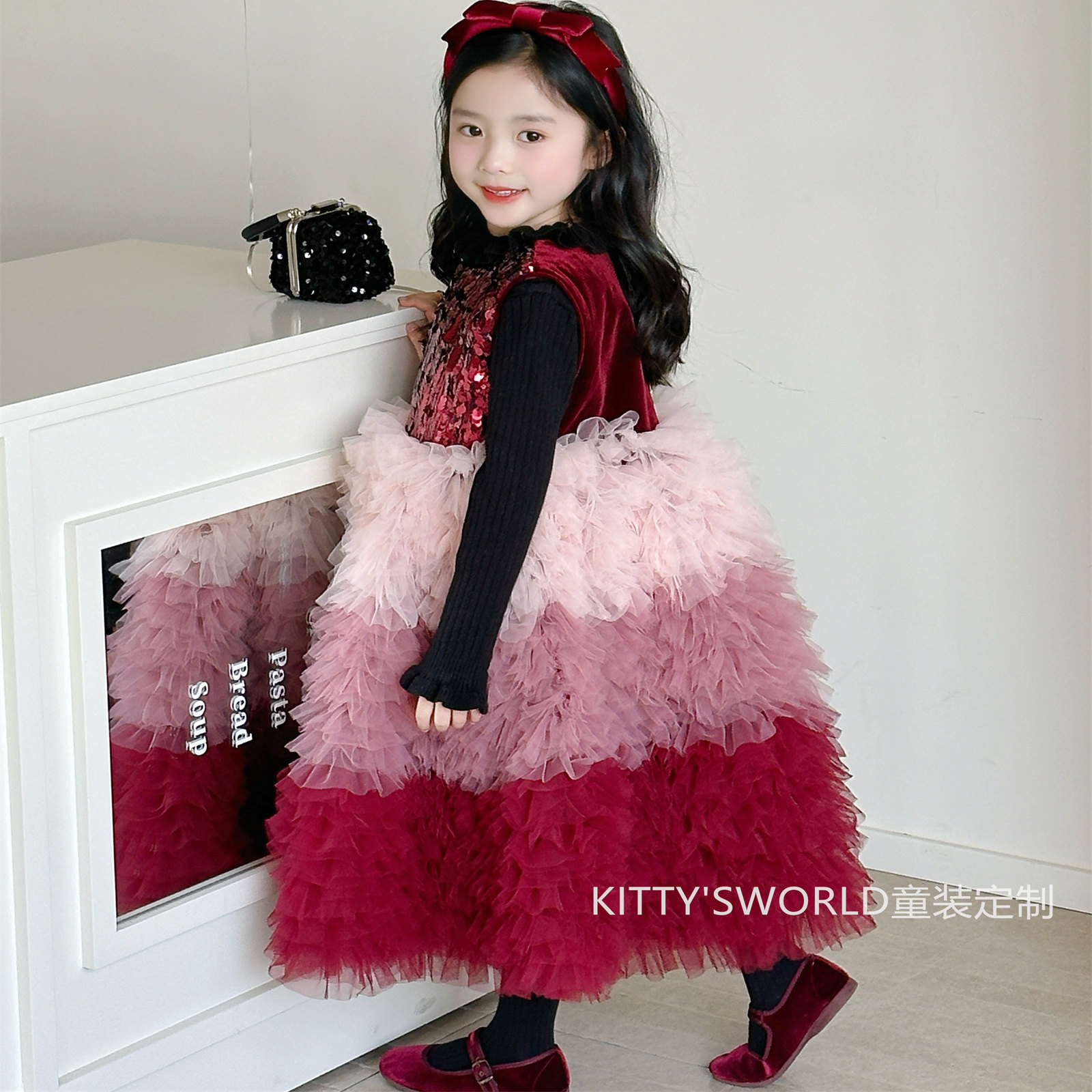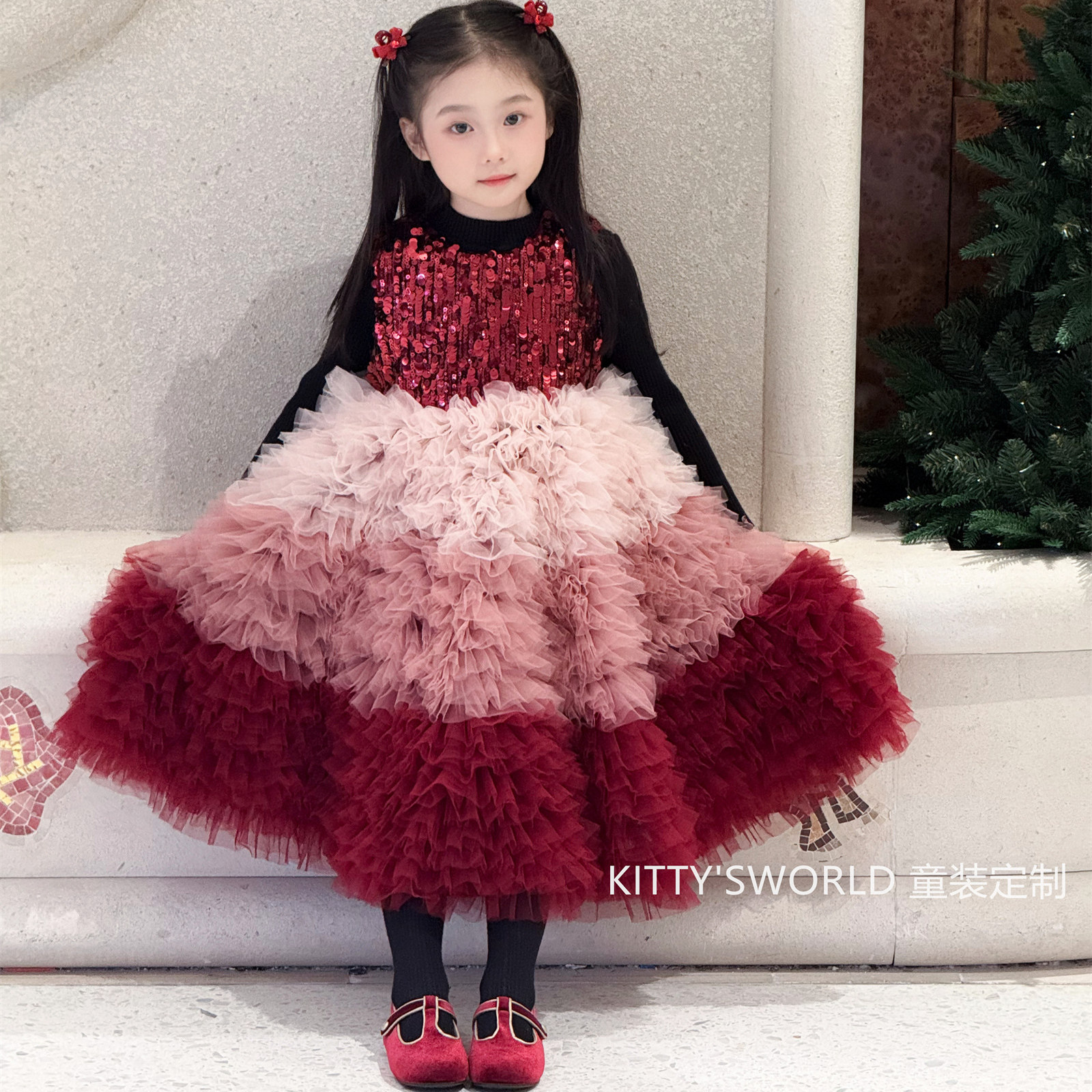 kw家女童红色亮片网纱连衣裙冬渐变蓬蓬蛋糕公主裙新年圣诞礼服