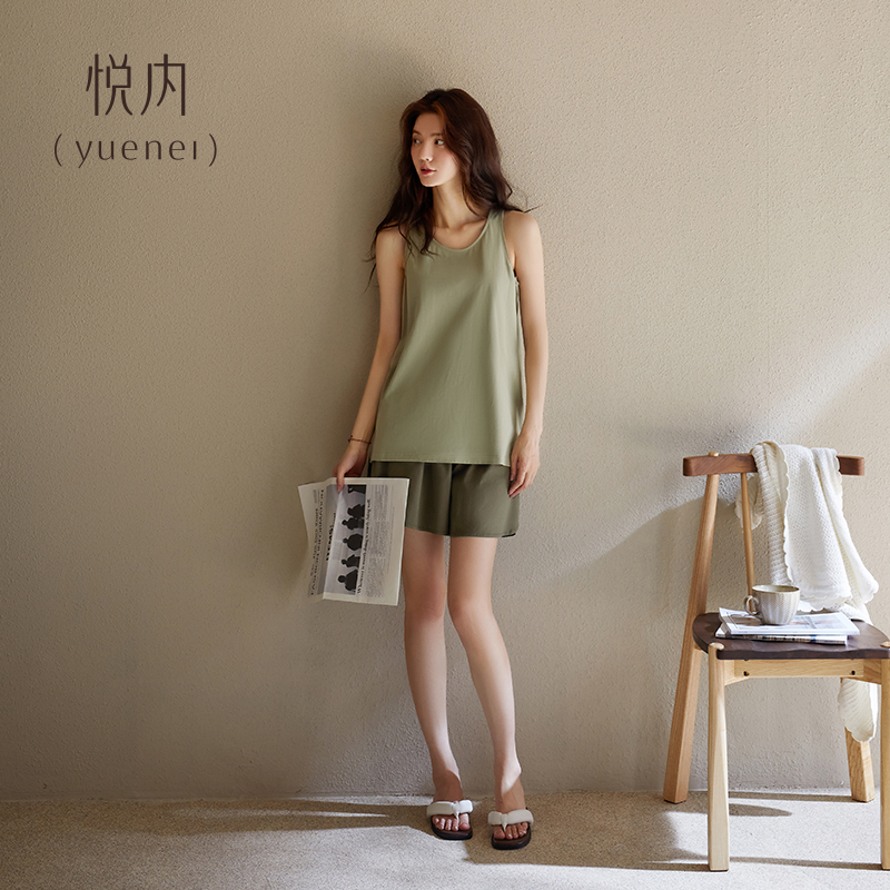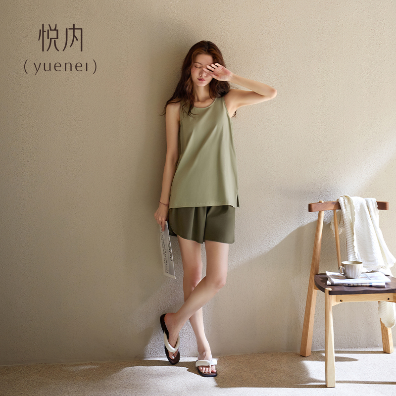 悦内带胸垫一体睡衣女款夏季无袖背心短裤纯棉家居服夏款夏天休闲