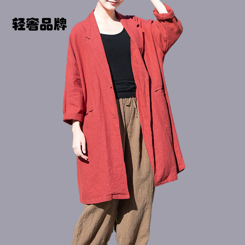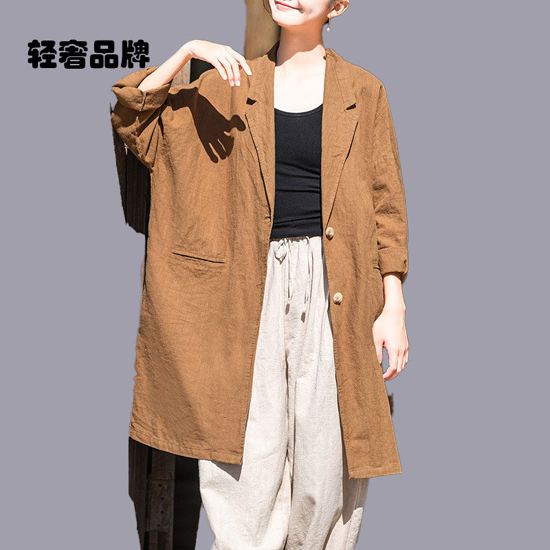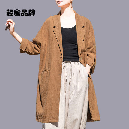 朗姿约定苎麻过膝中长款风衣女春秋2025新款单排扣西装领棉麻外套