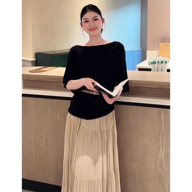 黑色圆领冰丝短袖针织衫女夏季搭配醋酸半身裙老钱风女装穿搭上衣
