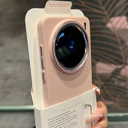 樱花粉色荔枝纹颗粒手感硬壳适用17promax小米15手机壳14pro仿皮纹13大孔ultra超薄轻薄高级素皮全包金属镜头