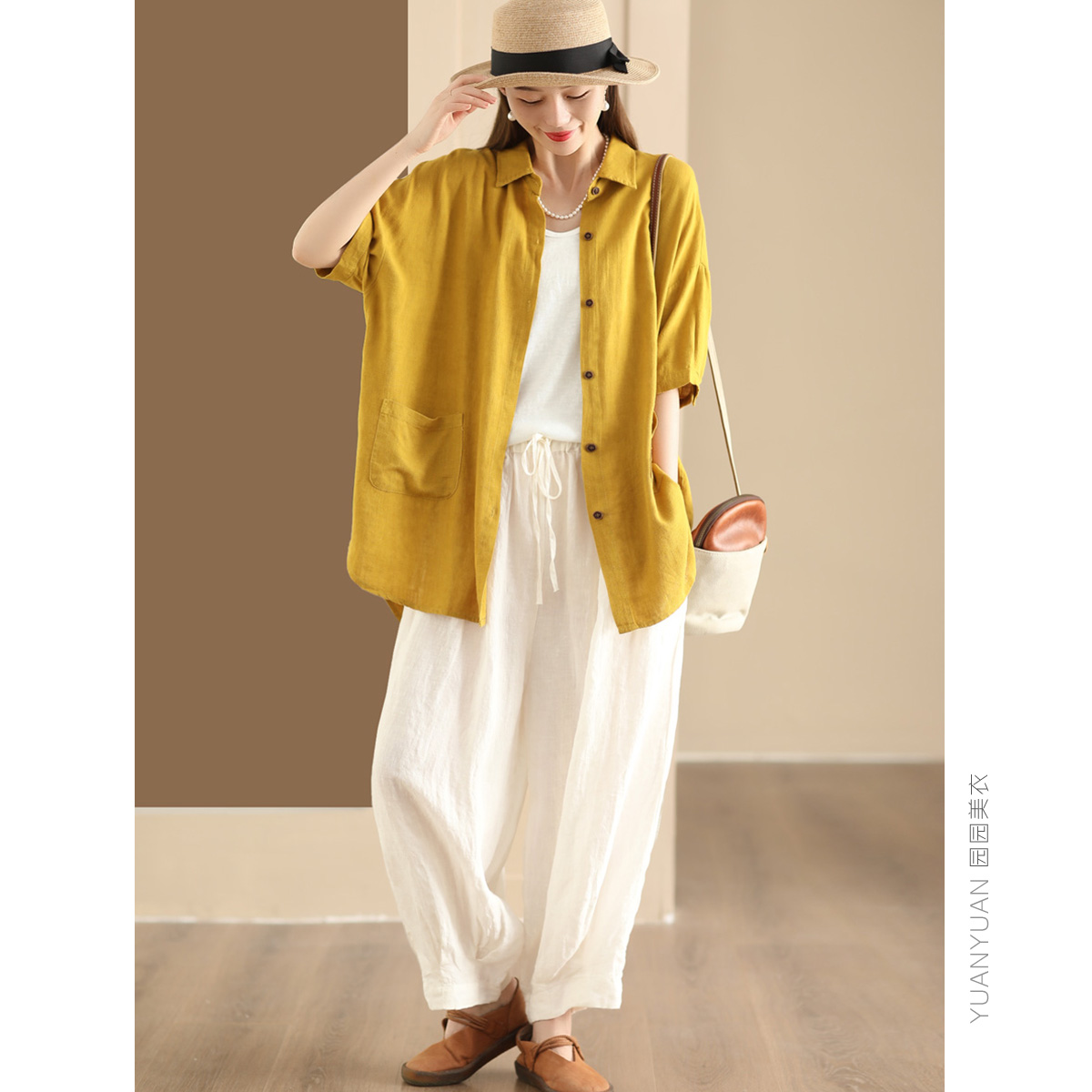 宽松复古单排扣中袖亚麻口袋衬衫