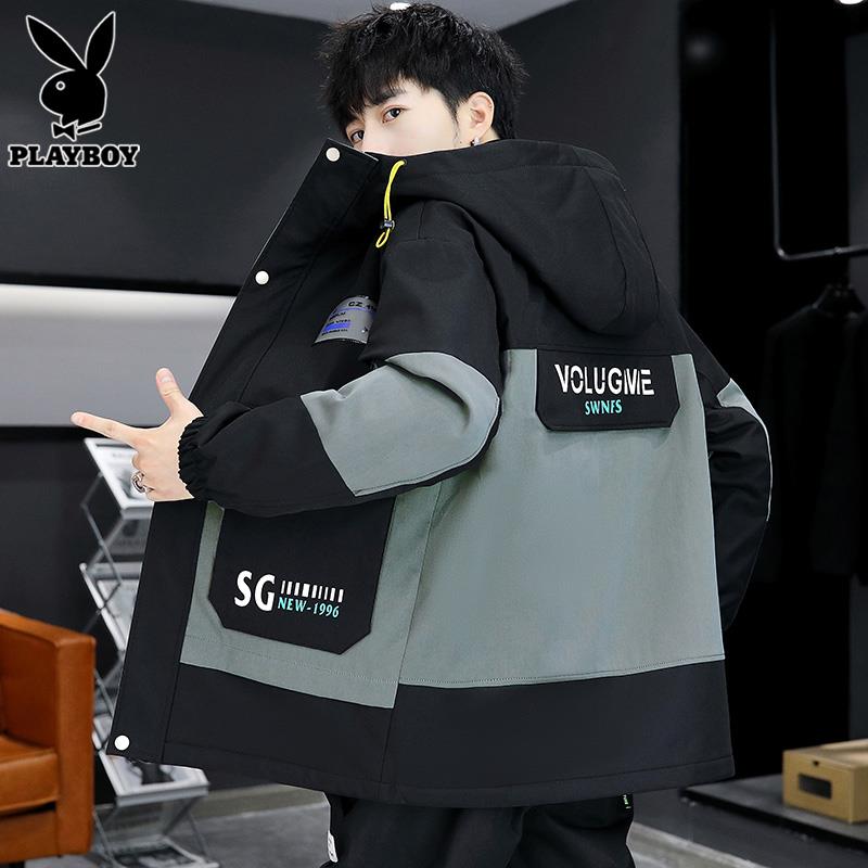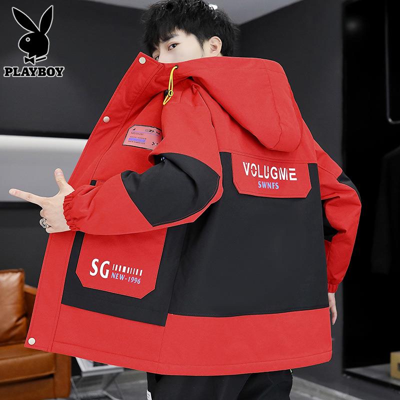 花花公子春秋季外套男士休闲拼色冲锋衣2025新款工装连帽夹克男款