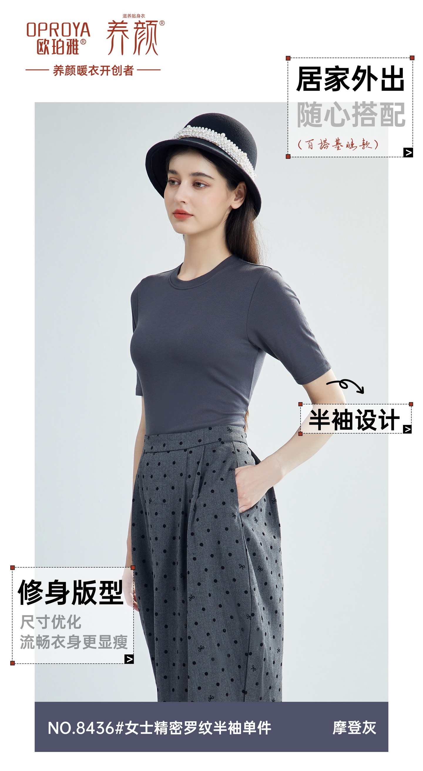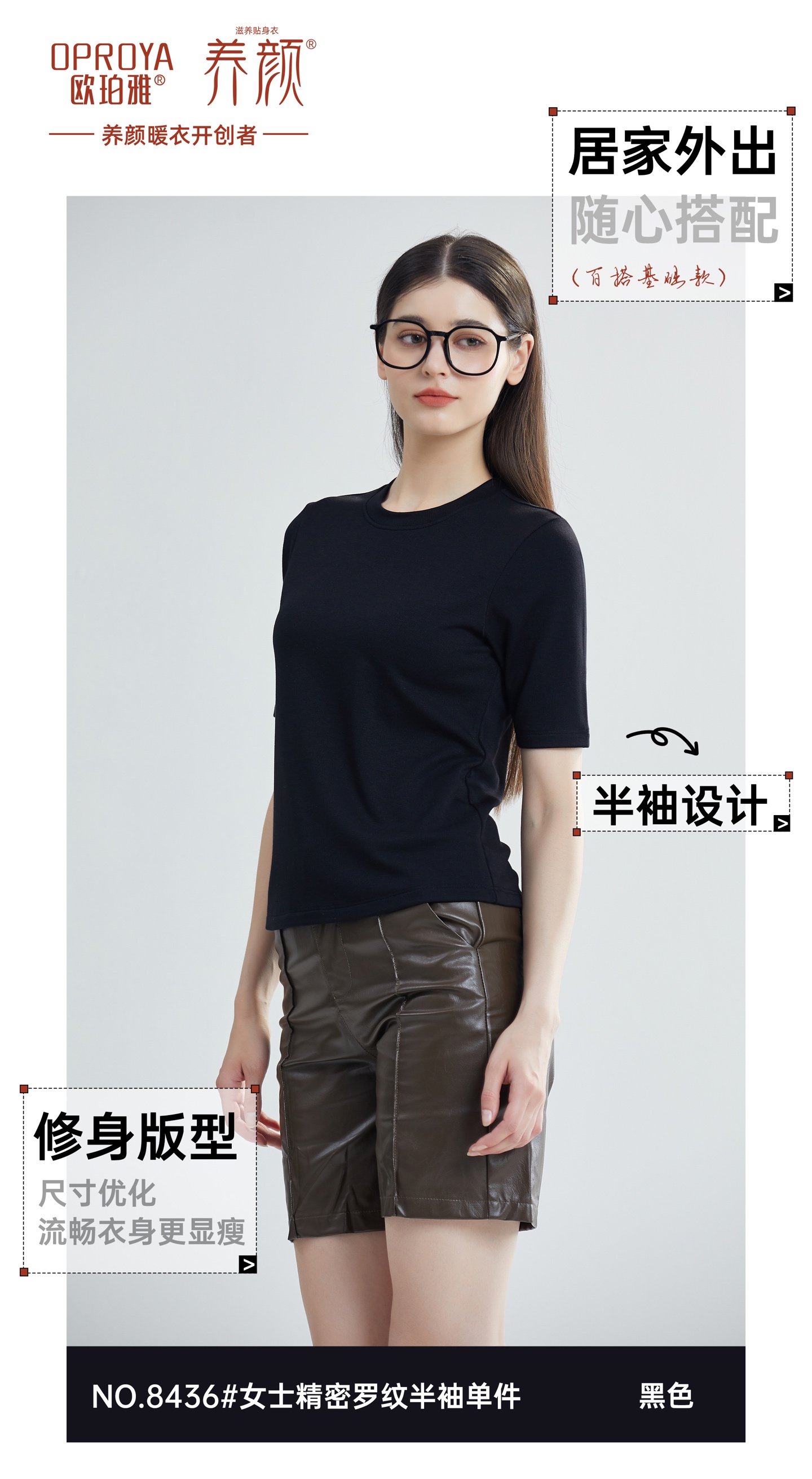 欧珀雅女士百搭打底半袖螺纹单面绒小衫8436