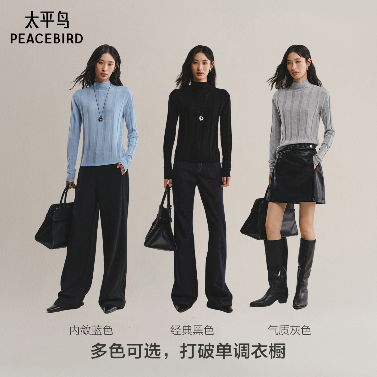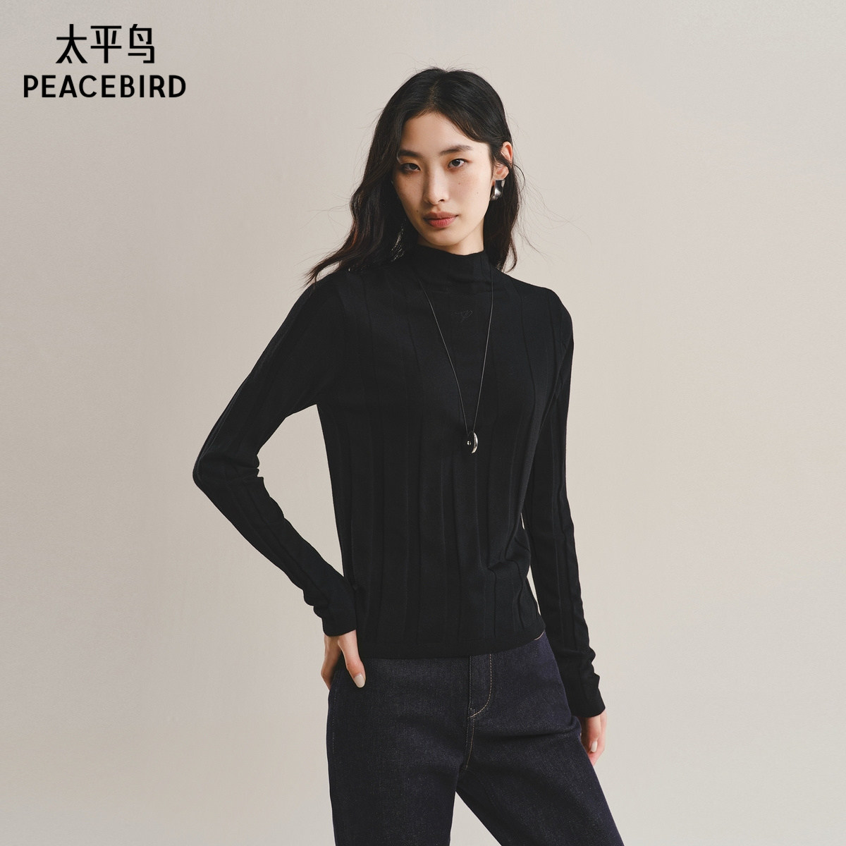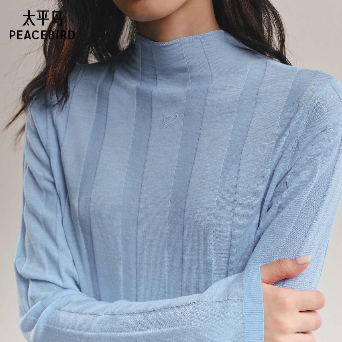 太平鸟羊毛桑蚕丝混纺打底针织衫25冬季新款竖条纹显瘦半高领毛衫