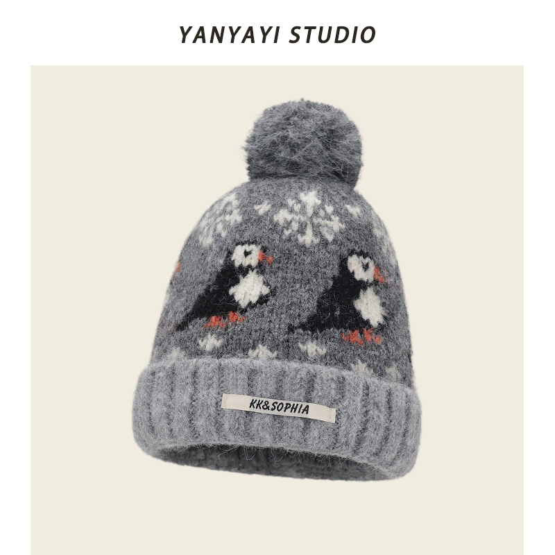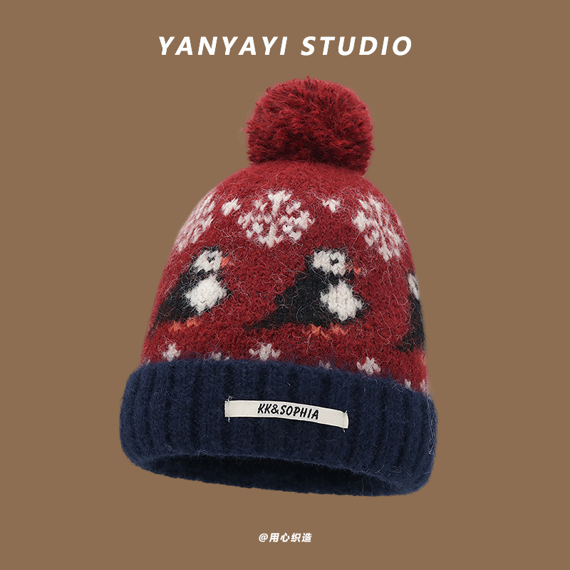 日系可爱企鹅刺绣毛球毛线帽女秋冬季保暖护耳百搭显脸小针织帽子