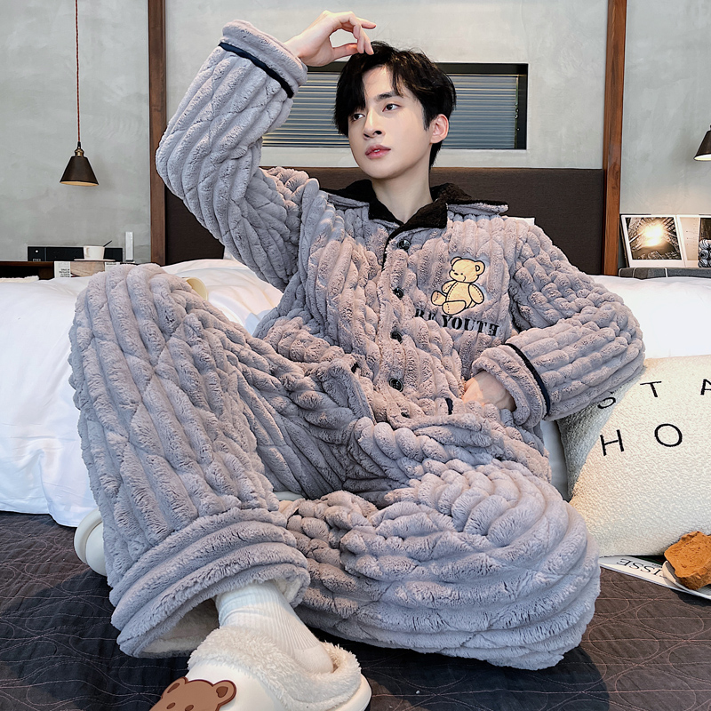 秋冬季男士睡衣加绒加厚三层夹棉男款珊瑚绒冬季青少年法兰绒套装