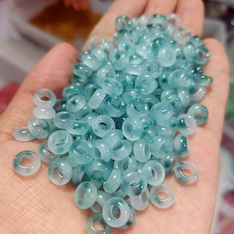 翡翠色偏蓝花石英岩玉大孔玉环算盘珠玉石散珠甜甜圈隔珠饰品配件