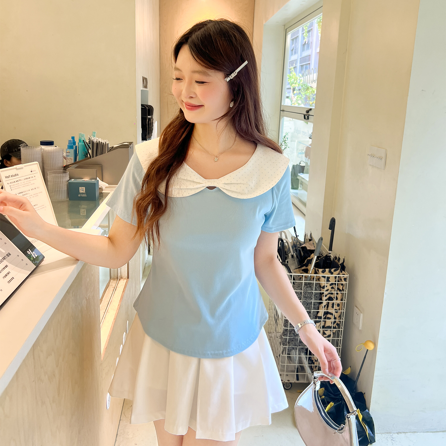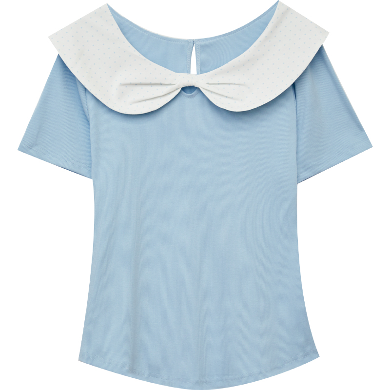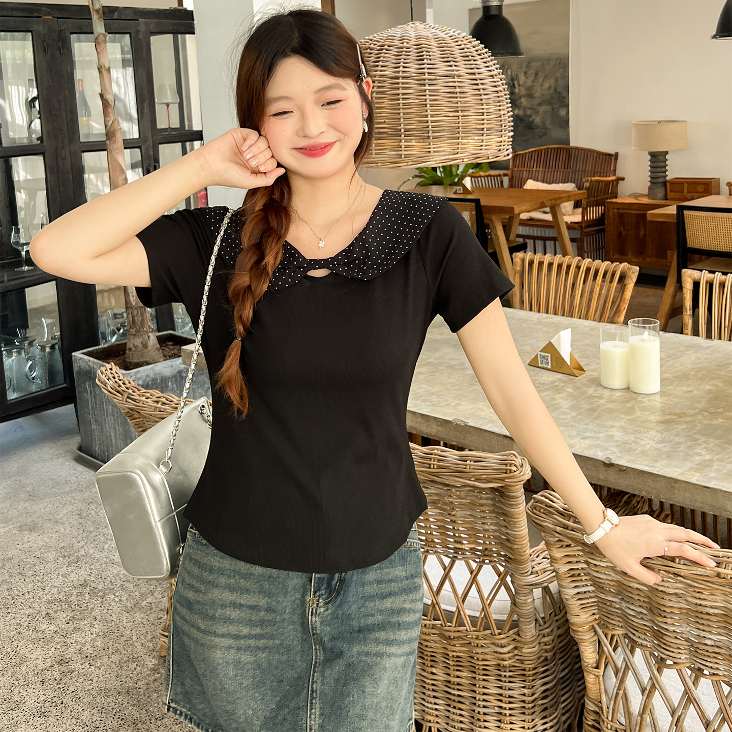 DM100大码百分百女装夏季胖mm波点蝴蝶结领正肩收腰显瘦短袖T恤